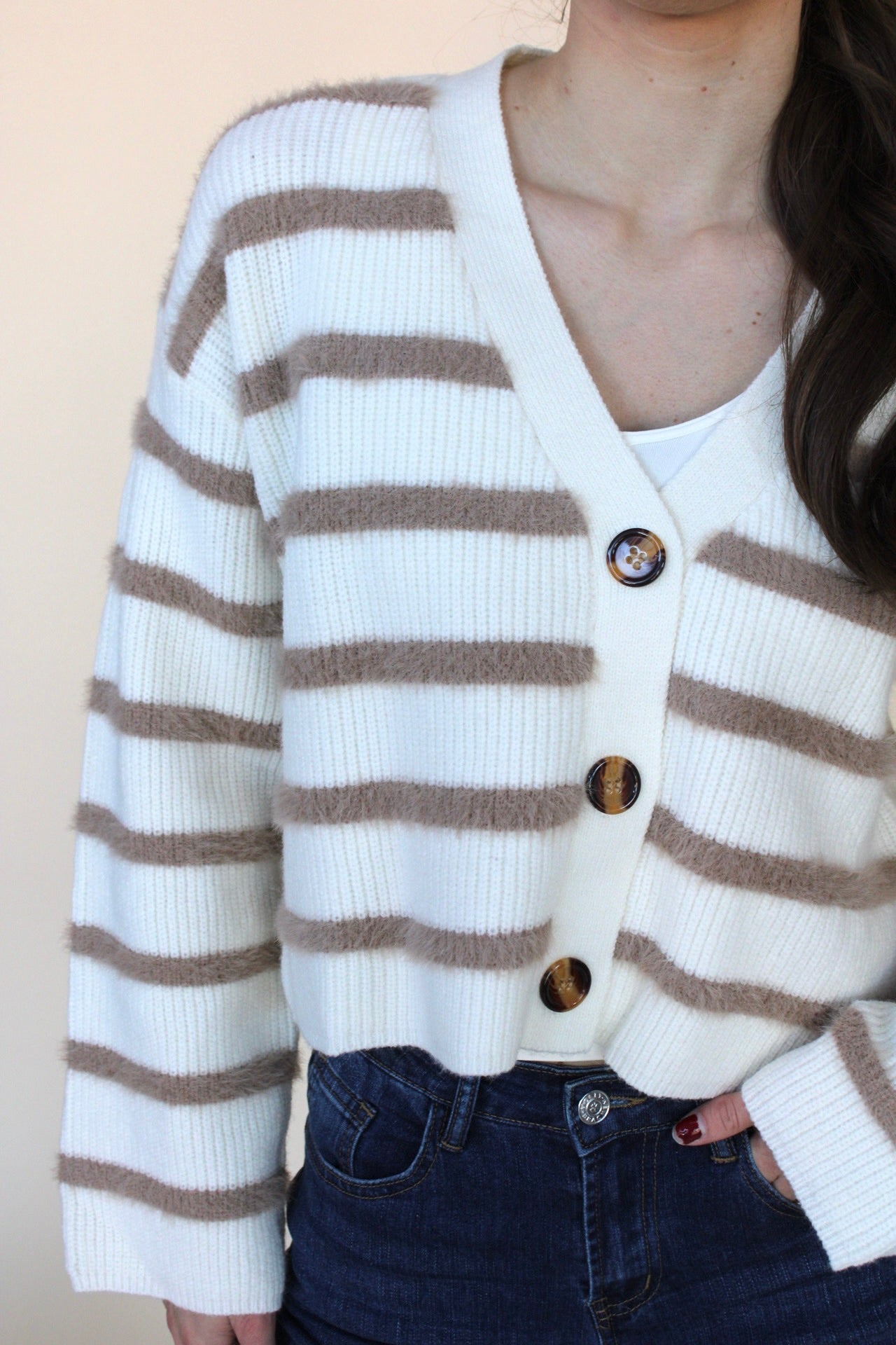 Effortless layering meets timeless style with this cream and taupe striped cardigan. The classic v-neck and button front make it perfect for pairing over dresses, tees, or tanks. Soft, versatile, and ready to transition seamlessly from season to season.