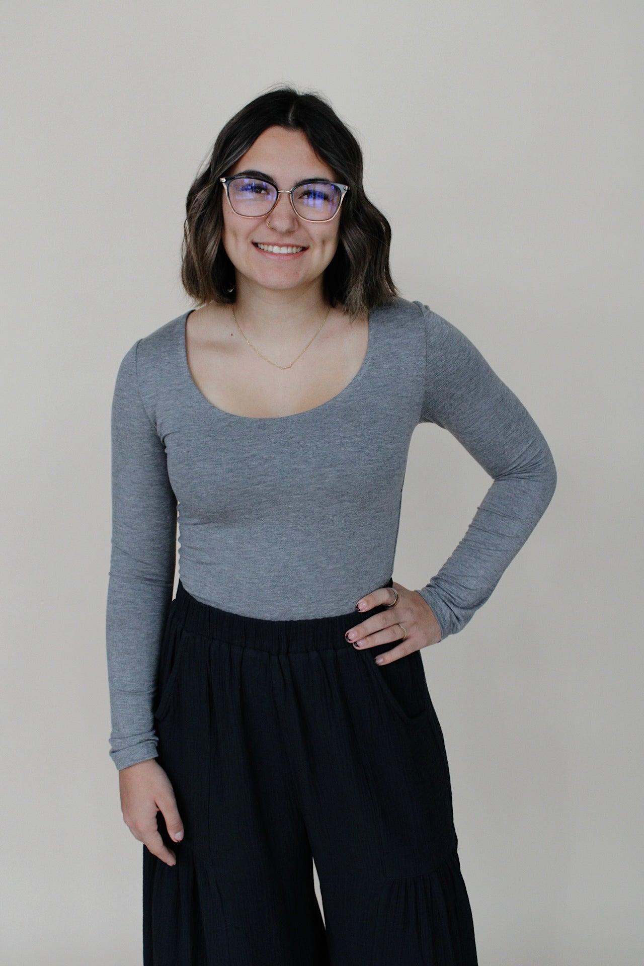 This core basic long sleeve in charcoal offers a soft, comfortable feel with a mid cropped length for a modern, easy fit. Perfect as a versatile layering piece or on its own, it combines everyday comfort with a sleek, minimalist style.