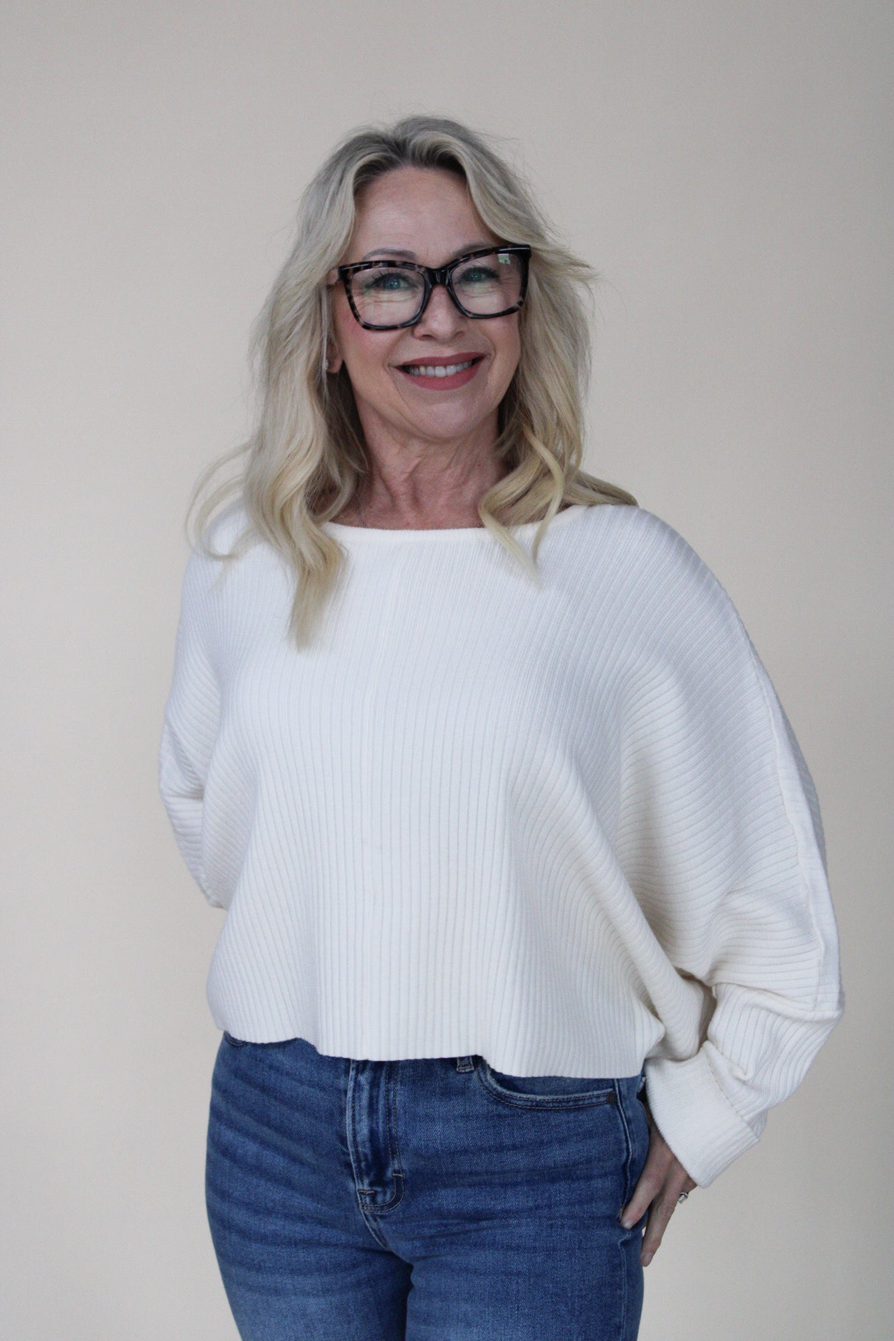 Cozy cream ribbed sweater featuring dolman sleeves for effortless style. The soft, textured knit offers comfort and warmth, while the relaxed silhouette works perfectly layered or worn solo. A versatile wardrobe essential that transitions seamlessly from casual days to evening outings.