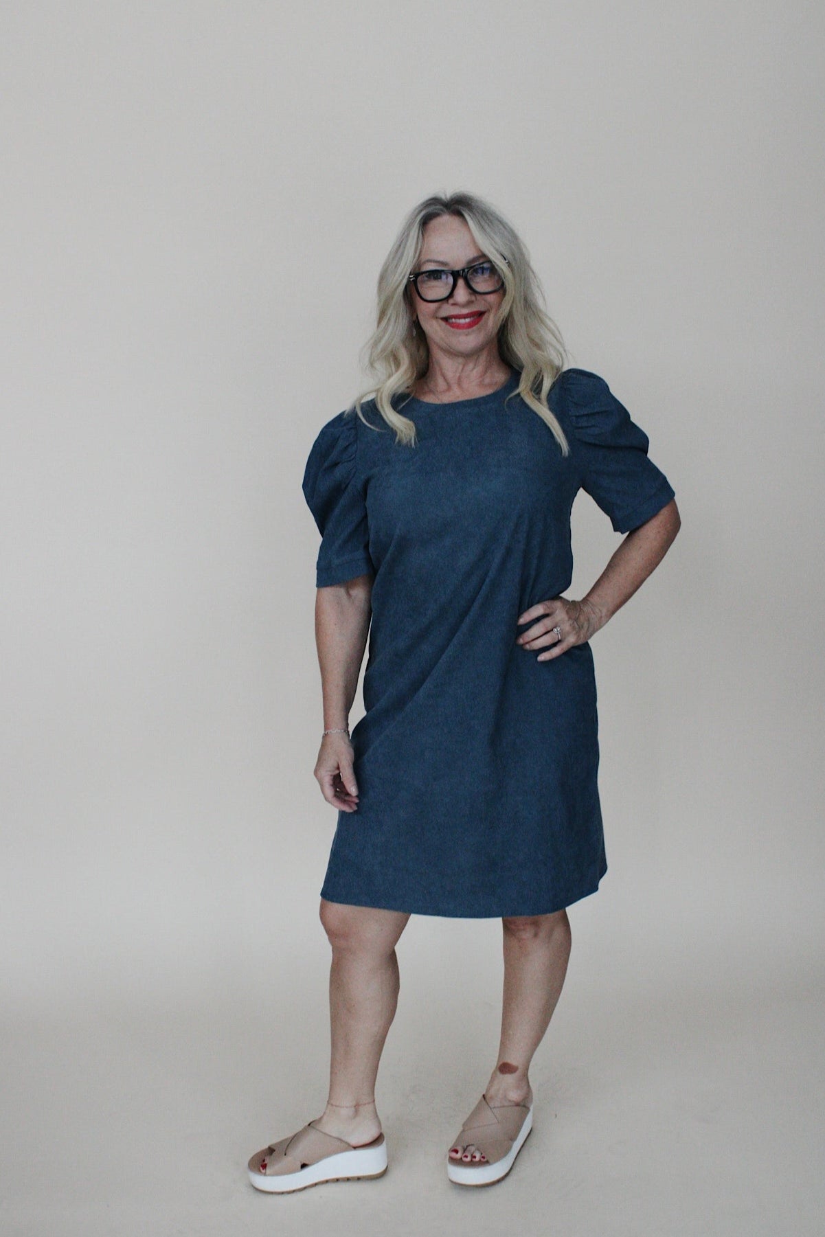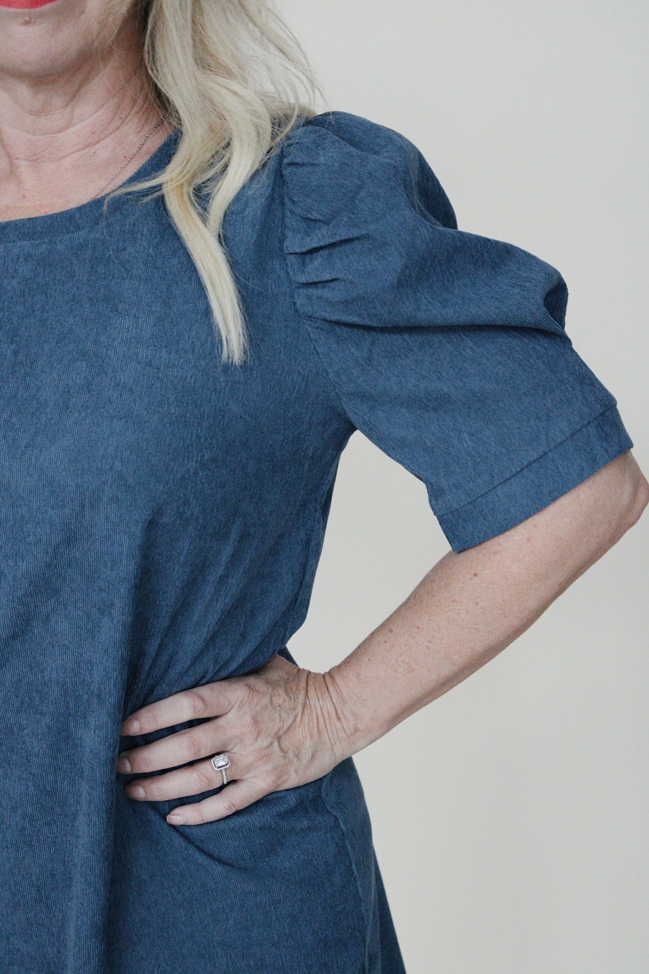 This dusty blue corduroy mini dress features charming puff sleeves for a touch of style. Its soft fabric and flattering cut make it comfortable and easy to wear for casual outings or special occasions. A versatile addition to your wardrobe.