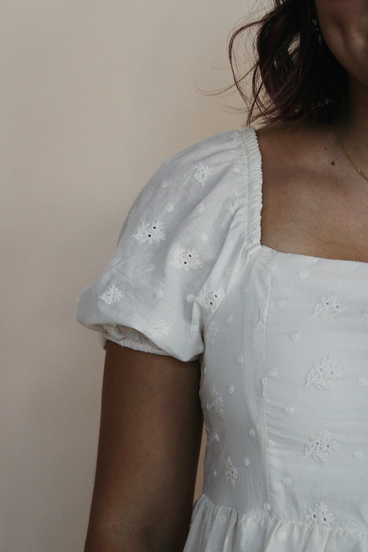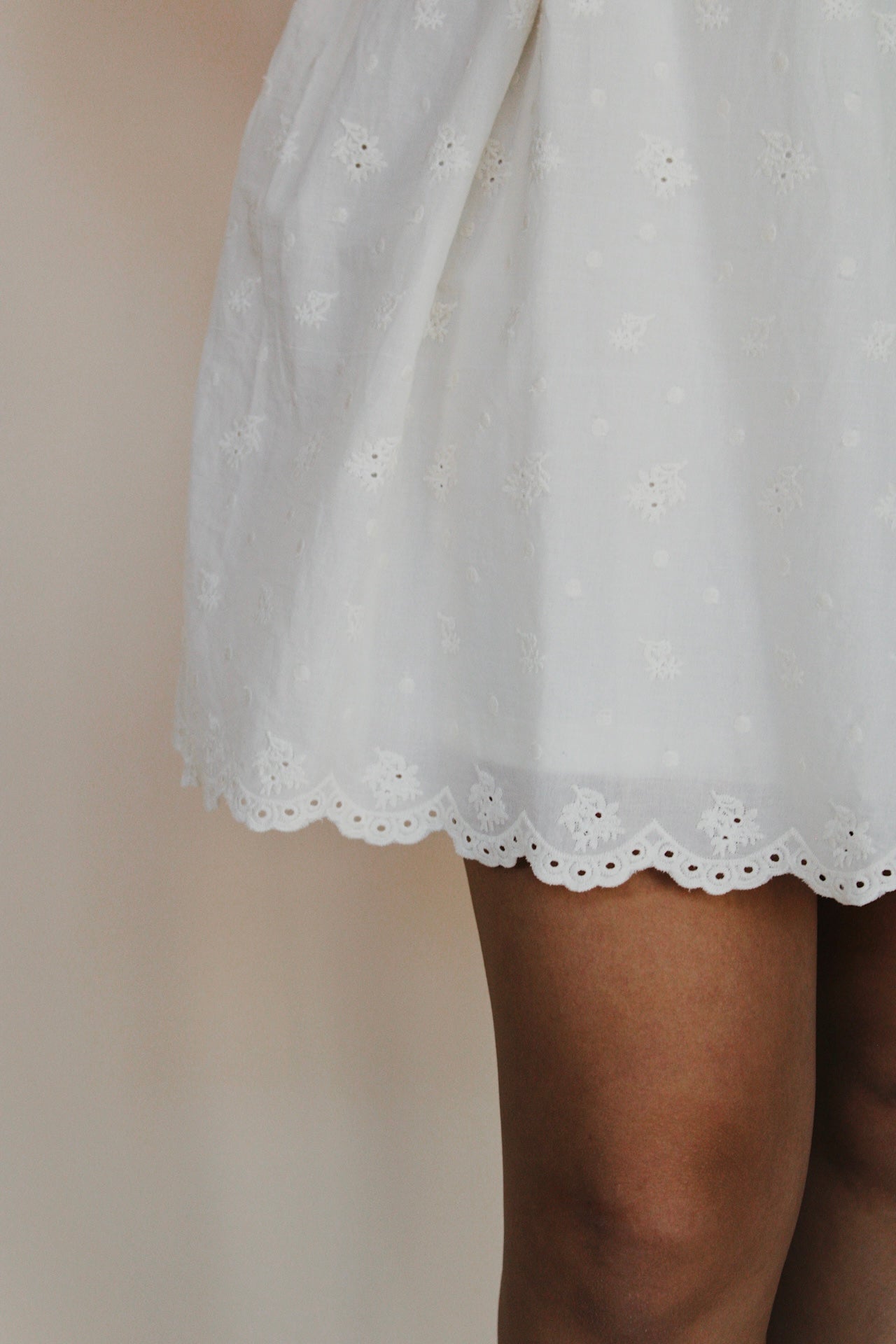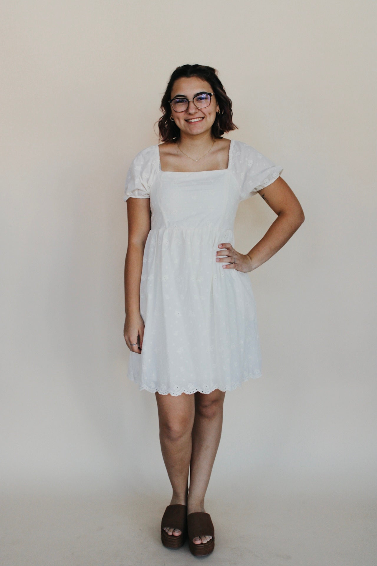 This babydoll mini dress features delicate cream eyelet fabric for a light and airy feel. Its relaxed fit and short length make it perfect for warm days, offering comfort and style.