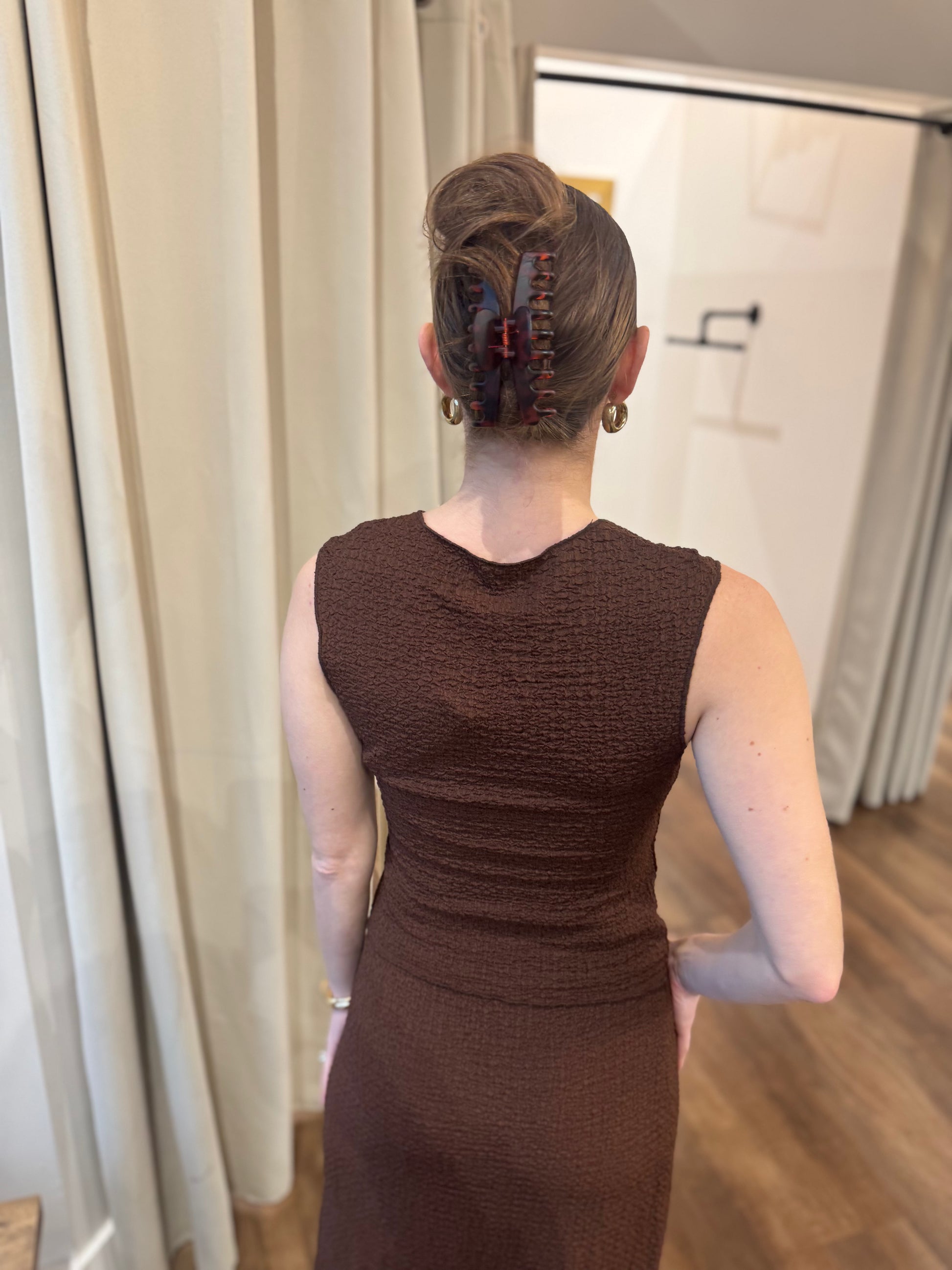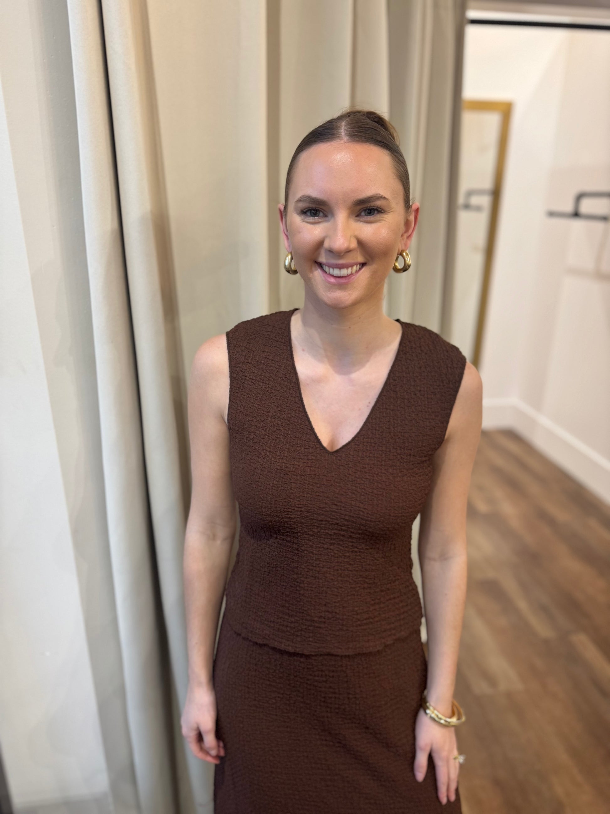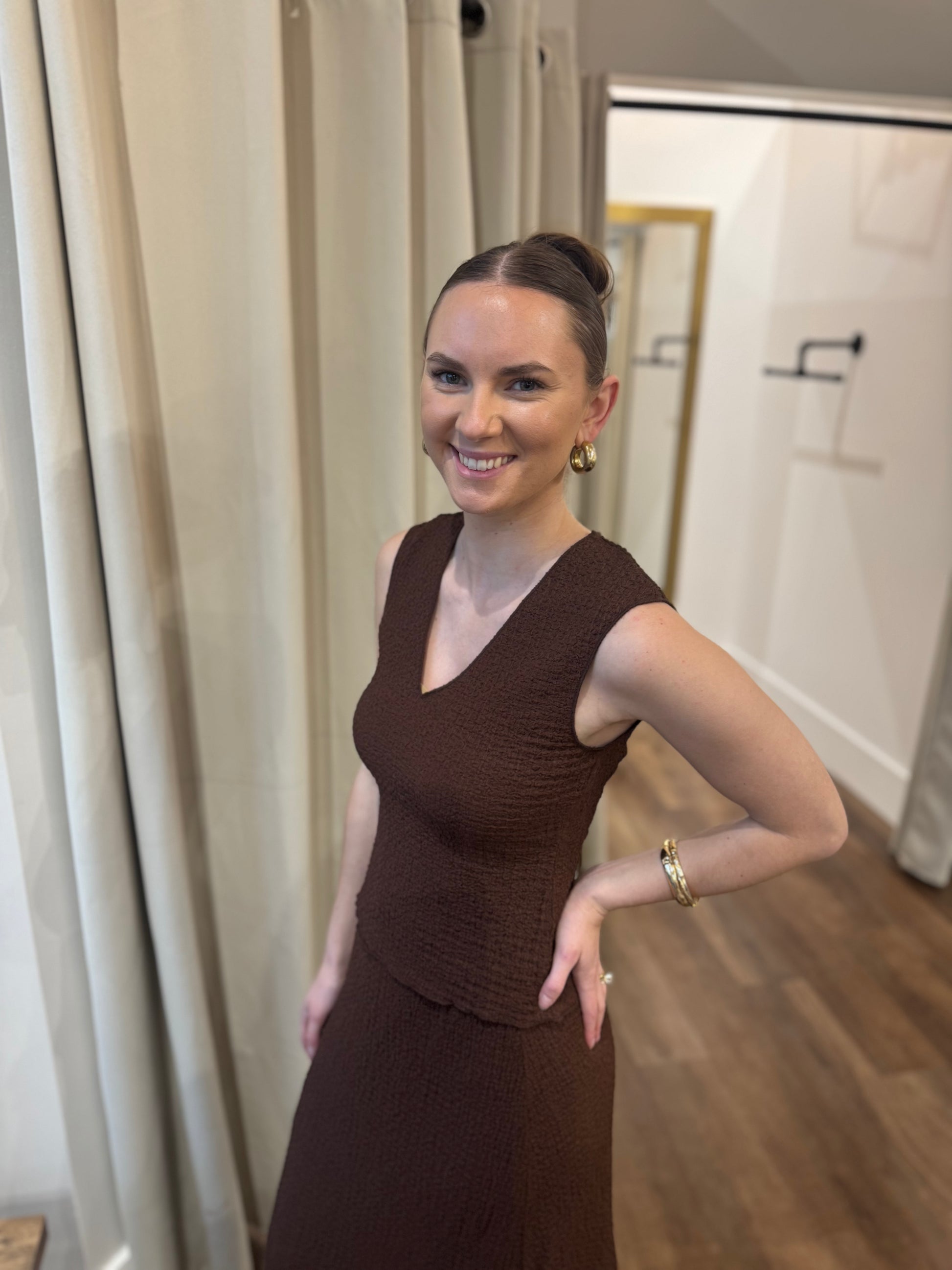 Effortless lightweight brown tank featuring a bubble textured that keeps things interesting. The neutral tone works with everything in your closet. You can also buy the matching tank to wear this as a set.