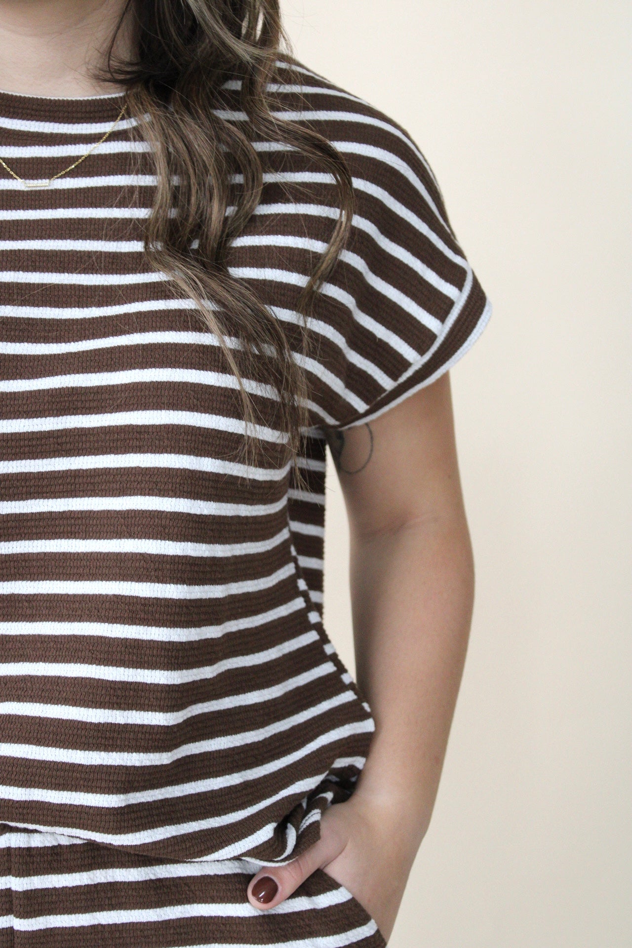 Classic brown and white stripes meet comfortable ribbed fabric in this versatile short-sleeve essential. A wardrobe staple that delivers both style and comfort. You can also buy the matching pants to wear it as a set.