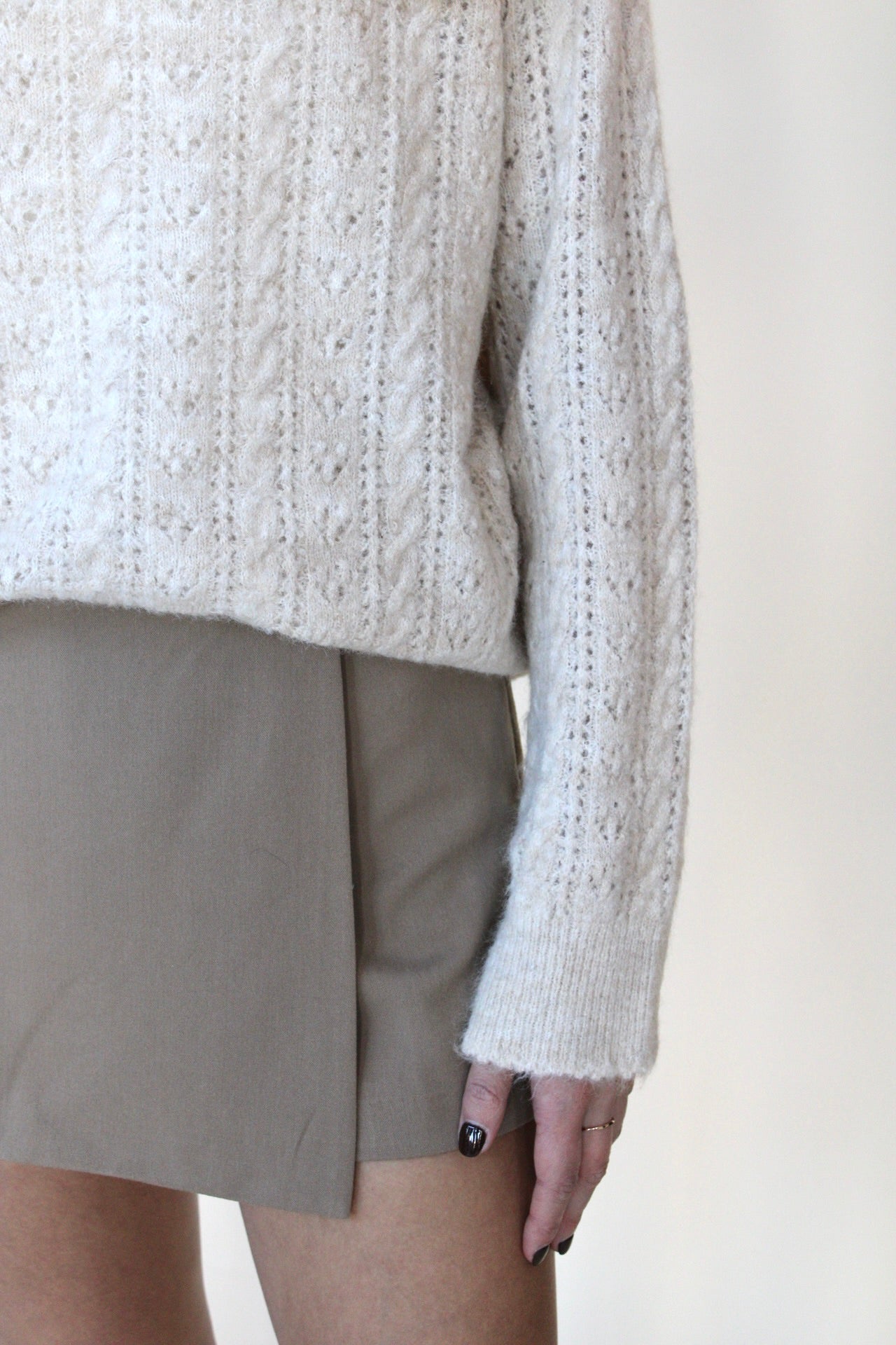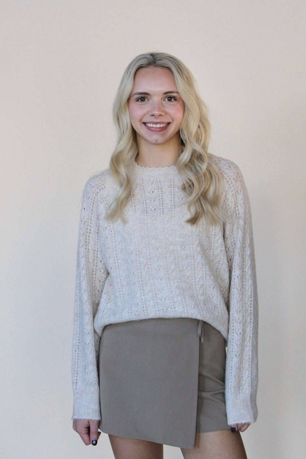 Effortless and playful, this beige mini skort pairs comfort with style. The charming side tie detail adds a flirty touch, while the skort silhouette keeps you covered and confident. Perfect for casual outings or dressing up.