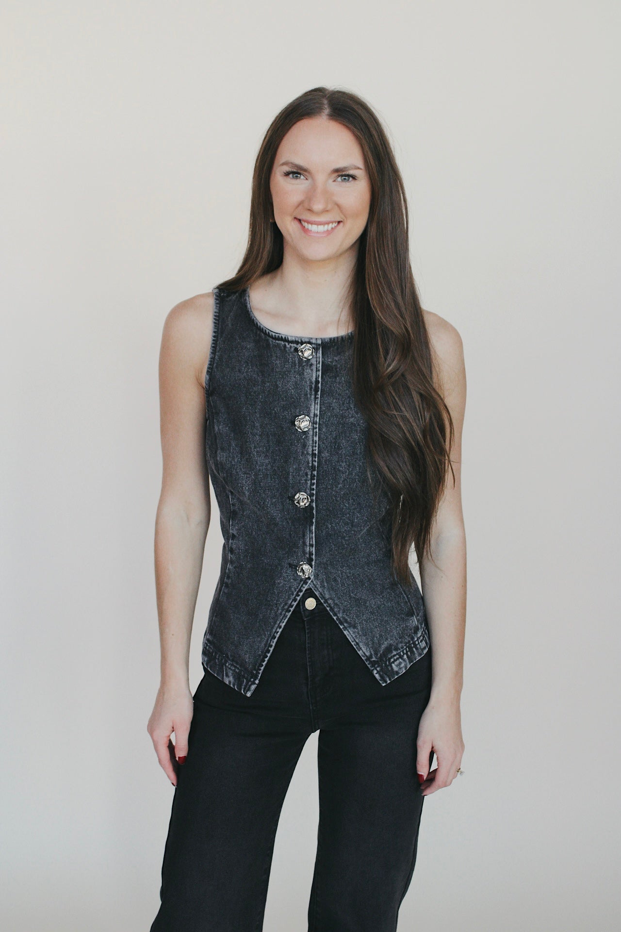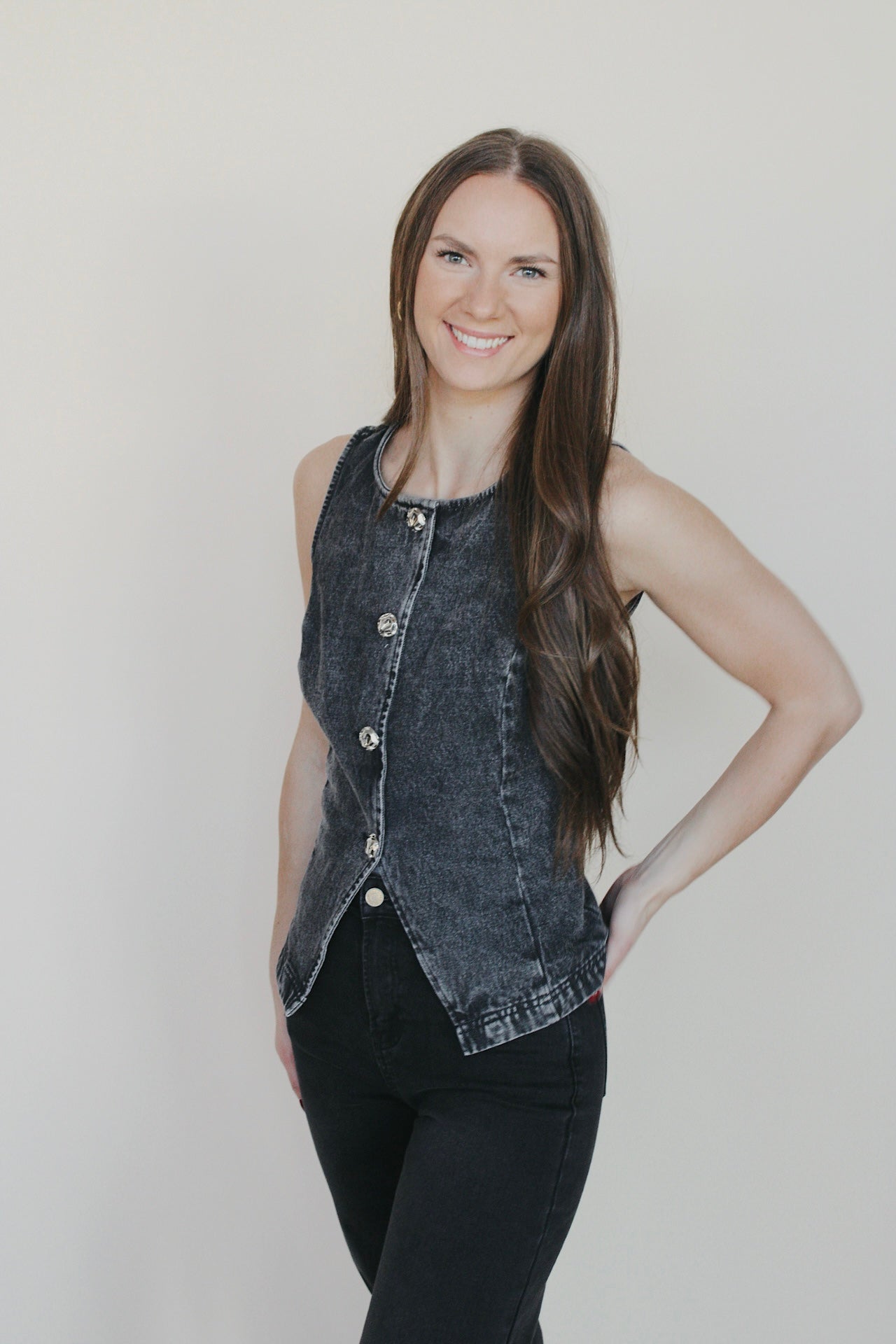 The Ella Denim Vest features a washed black denim fabric paired with stylish silver buttons. Its classic design offers a versatile layering option, adding an edgy touch to any outfit.