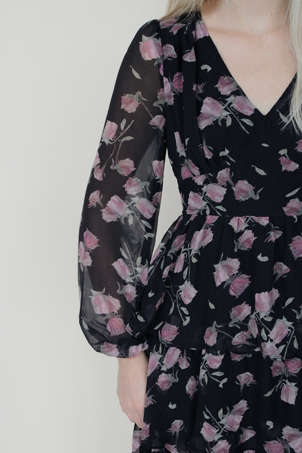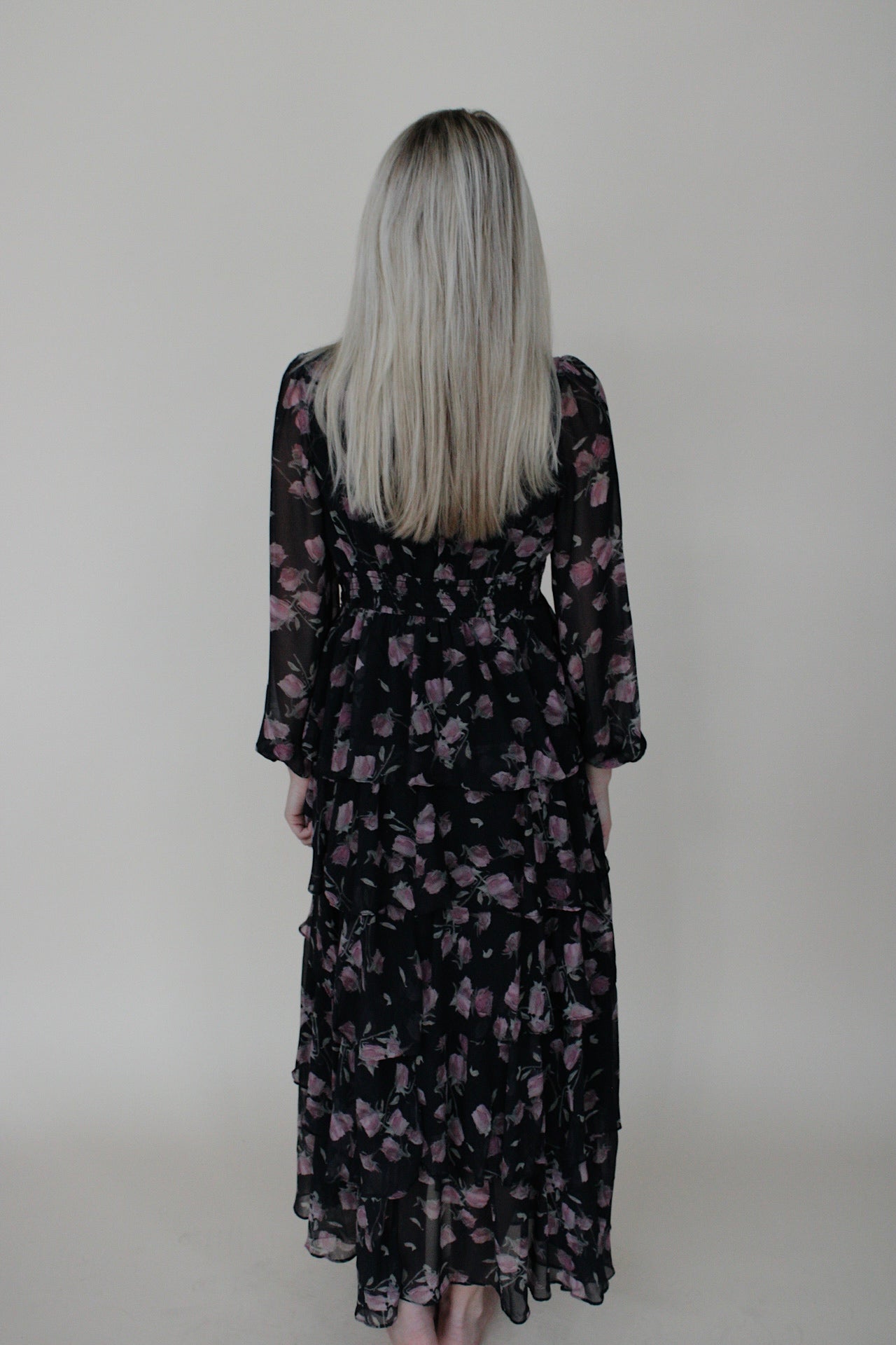 The floral maxi dress features a flowing silhouette with multiple tiers that add soft movement. Its black fabric with a delicate floral pattern, creates an elegant yet easy going look. Perfect for special occasions, this dress is beautiful.