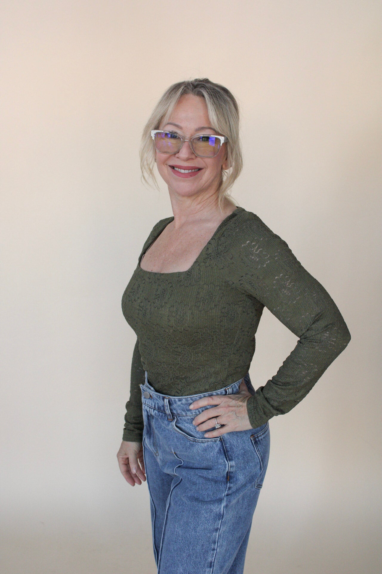 Elevate your wardrobe with this sophisticated embroidered top. Featuring delicate green lace detailing and a flattering square neckline, the long sleeves provide versatile coverage for any season. Perfect for layering or wearing solo, this piece transitions effortlessly from casual to polished occasions.