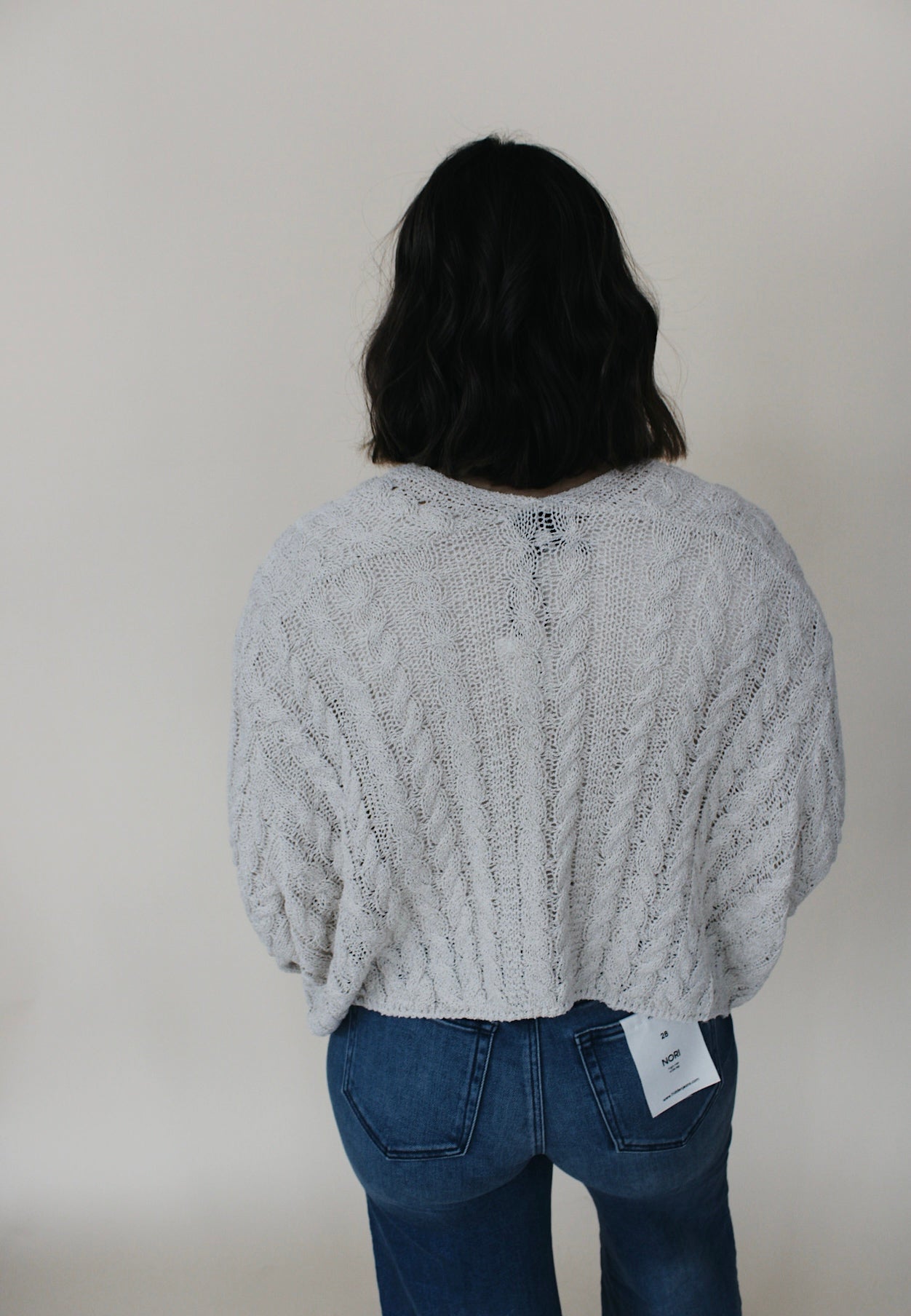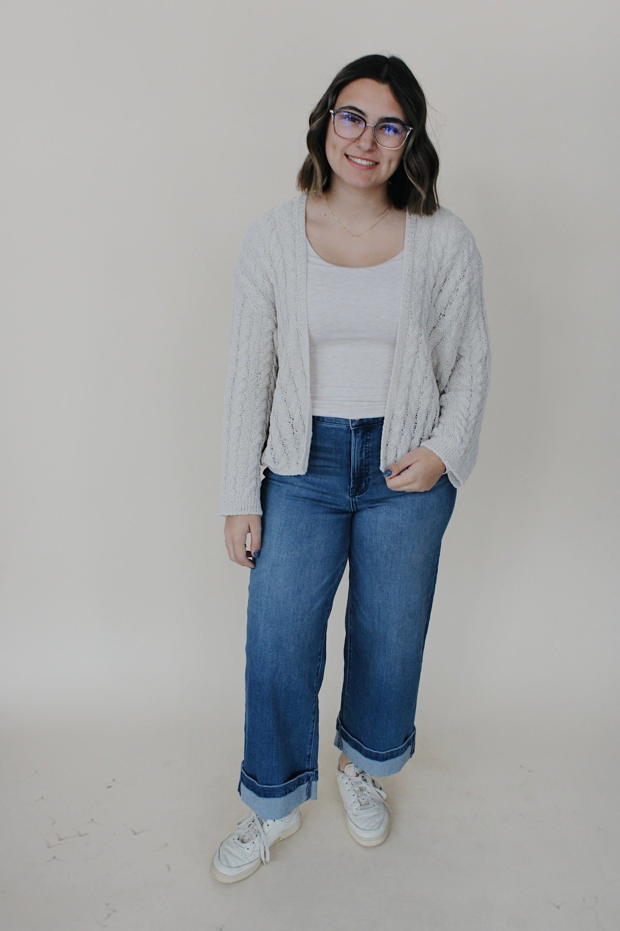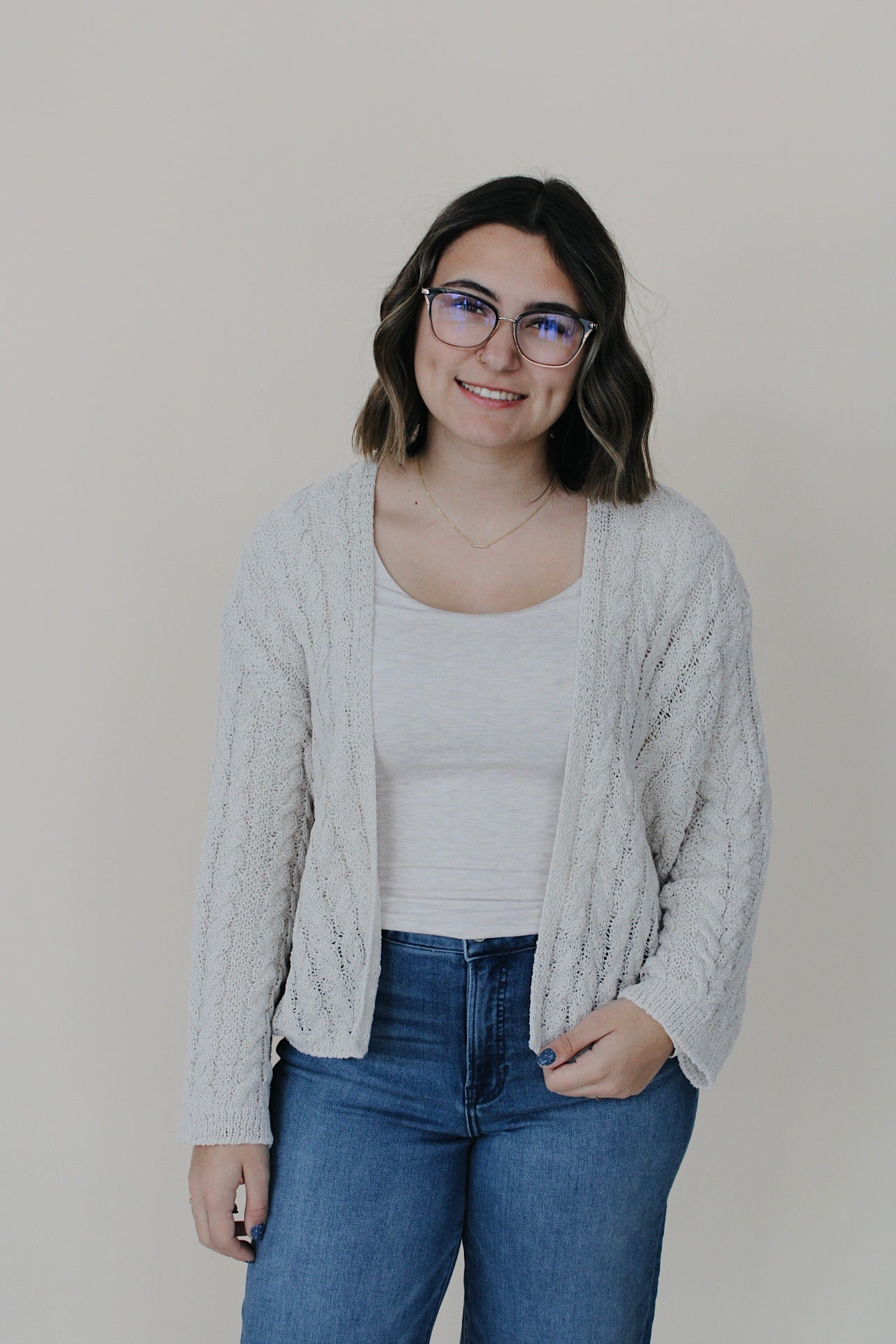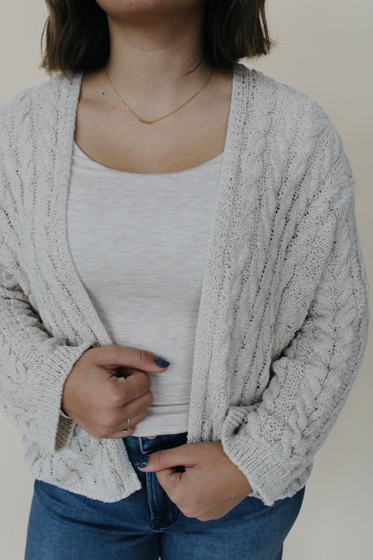 This stone colored lightweight, cropped cardigan is perfect for adding cozy warmth without bulk. Its delicate cable knit design offers subtle texture, making it an easy piece to pair with both casual and dressy outfits. Ideal for transitional weather, this cardigan keeps you comfortable and stylish all day.