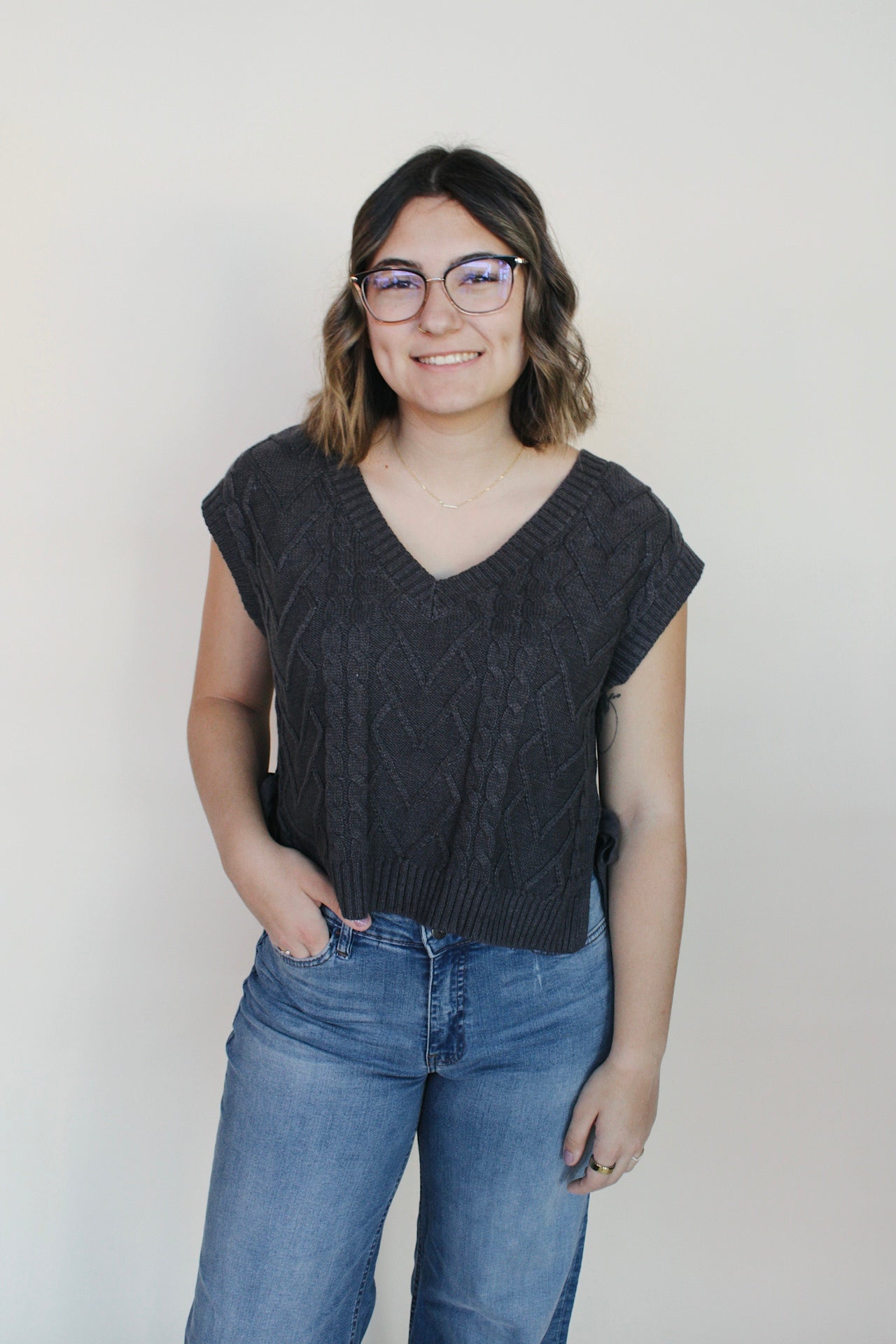 This charcoal cable knit sweater is the perfect transitional piece. Wear alone or layer with a camisole or long sleeve top. It's versatile and light weight. The tie feature on the side will definitely earn you complements. This sweater fits true to size.