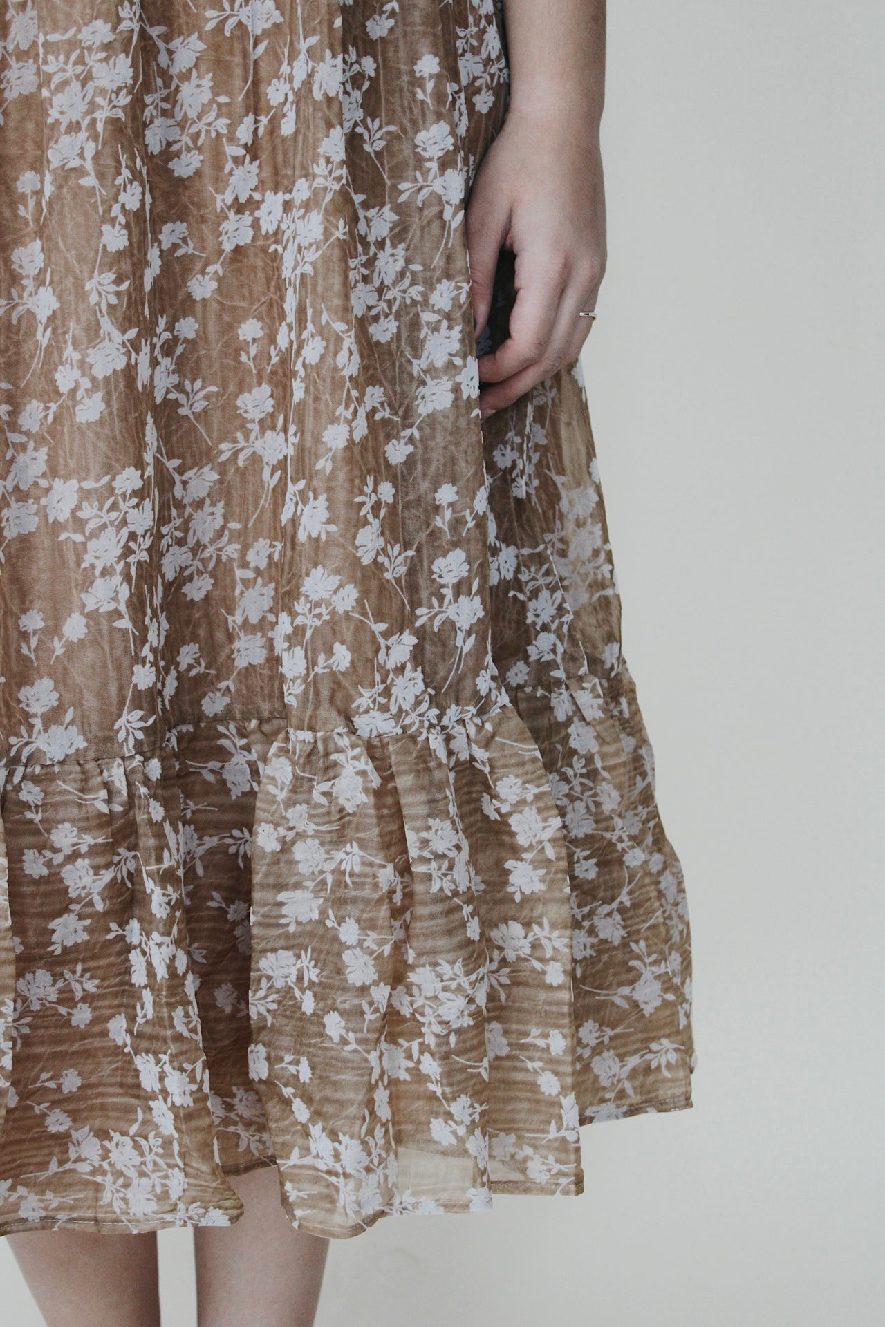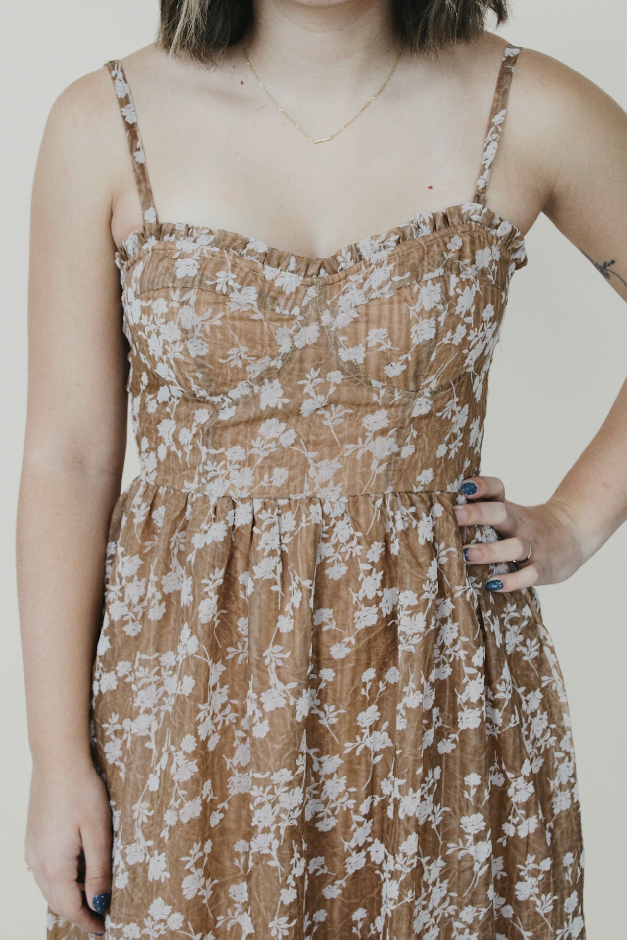 This brown floral midi dress features delicate ruffles and offers versatile styling options, it can be worn with straps or strapless. Its flattering silhouette and charming design make it perfect for any occasion.