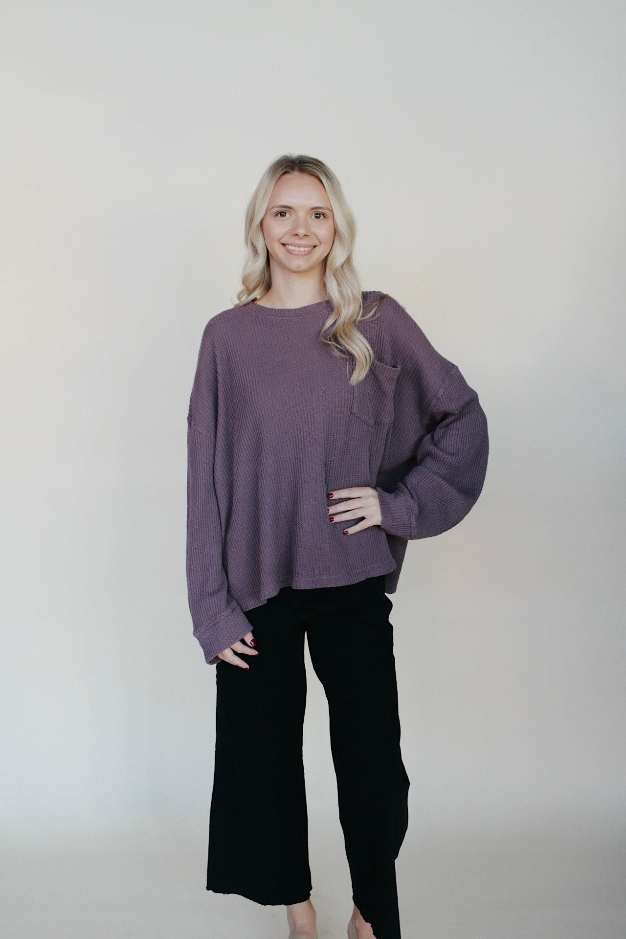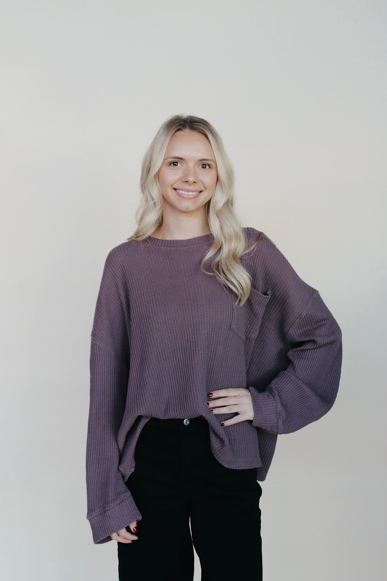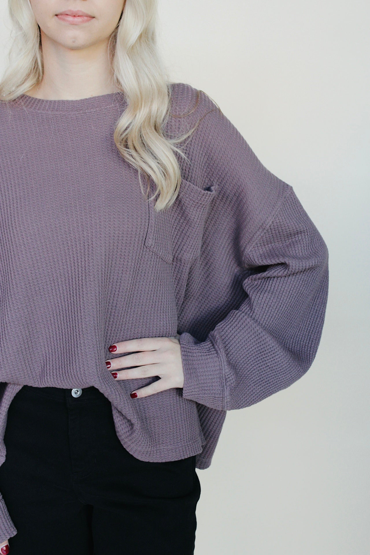 This oversized waffle long sleeve top in a soft purple hue offers cozy warmth and relaxed comfort. Made with a textured thermal fabric, it’s perfect for layering or wearing on its own for casual, everyday style.