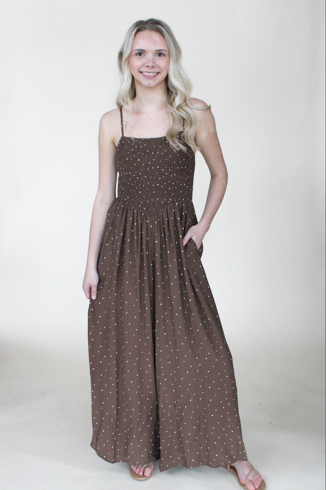 Effortless style meets playful charm in this chocolate jumpsuit. The smocked top provides a flattering fit while polka dots add a touch of whimsy. Wide legs offer comfort and movement, making it perfect for everything from casual outings to dressed-up occasions. A versatile piece that transitions seamlessly through your wardrobe.