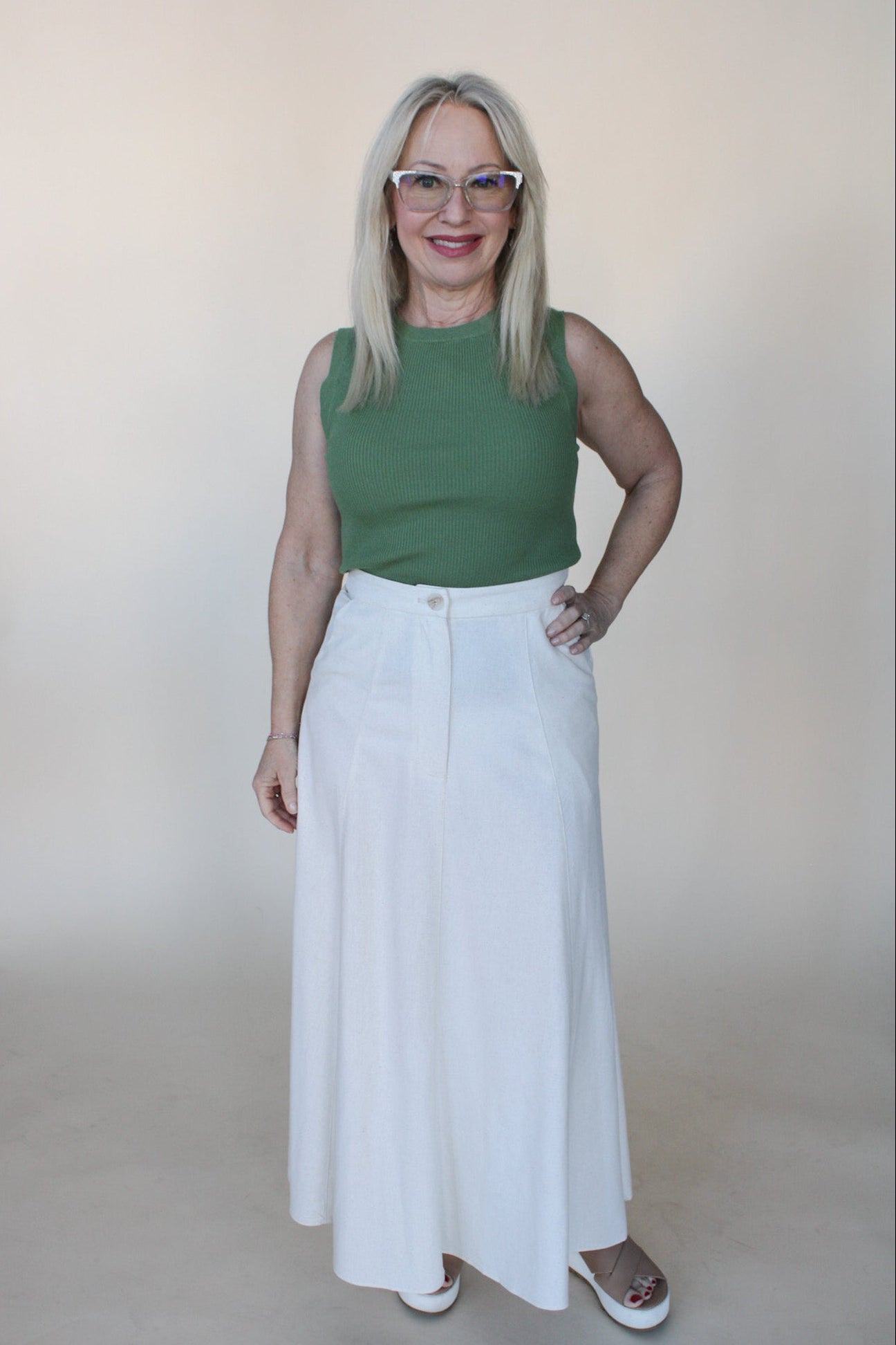 Effortless elegance in soft oatmeal linen. This maxi skirt flows beautifully with a relaxed fit that moves with you, perfect for warm days and casual outings. The natural fabric breathes while maintaining its shape, making it a versatile staple for any wardrobe.