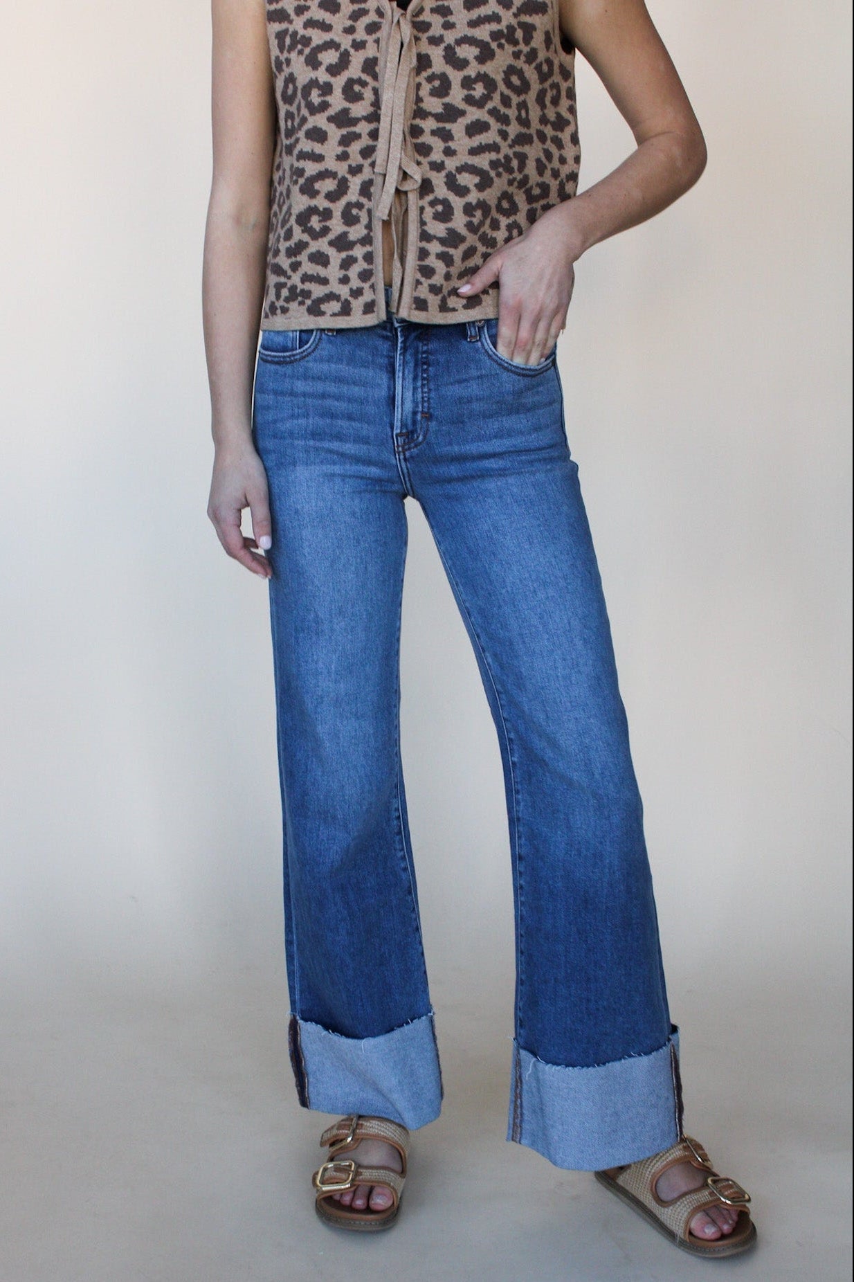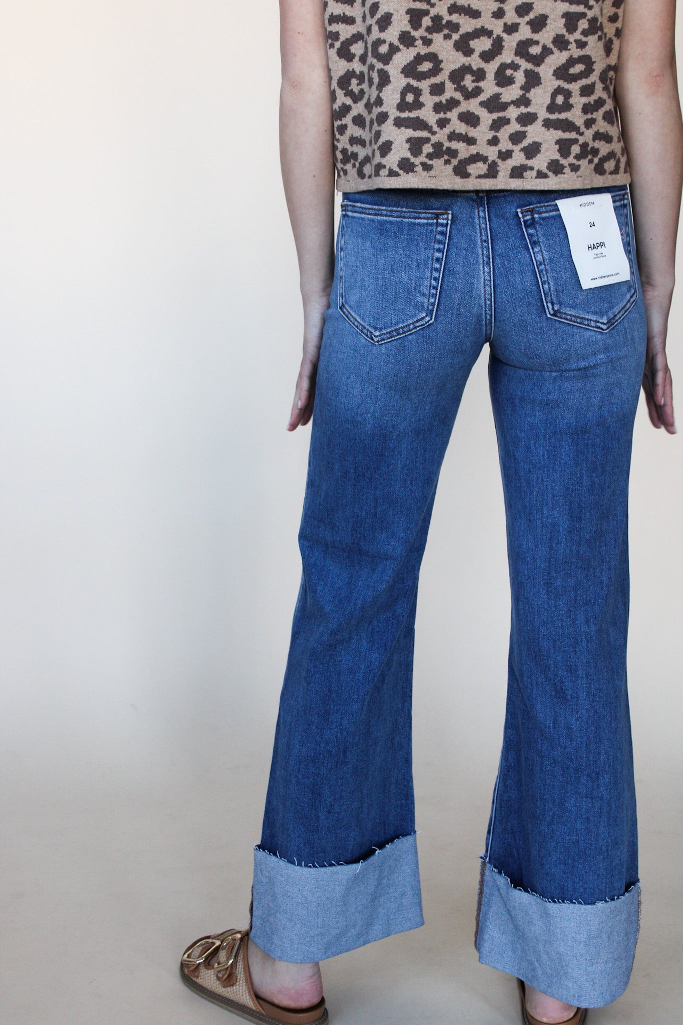 These high-waisted flare jeans feature a comfortable stretch fabric that moves with you throughout the day. The cuffed hem and flared silhouette adds the cutest detail while the soft denim keeps you feeling great from morning to night.