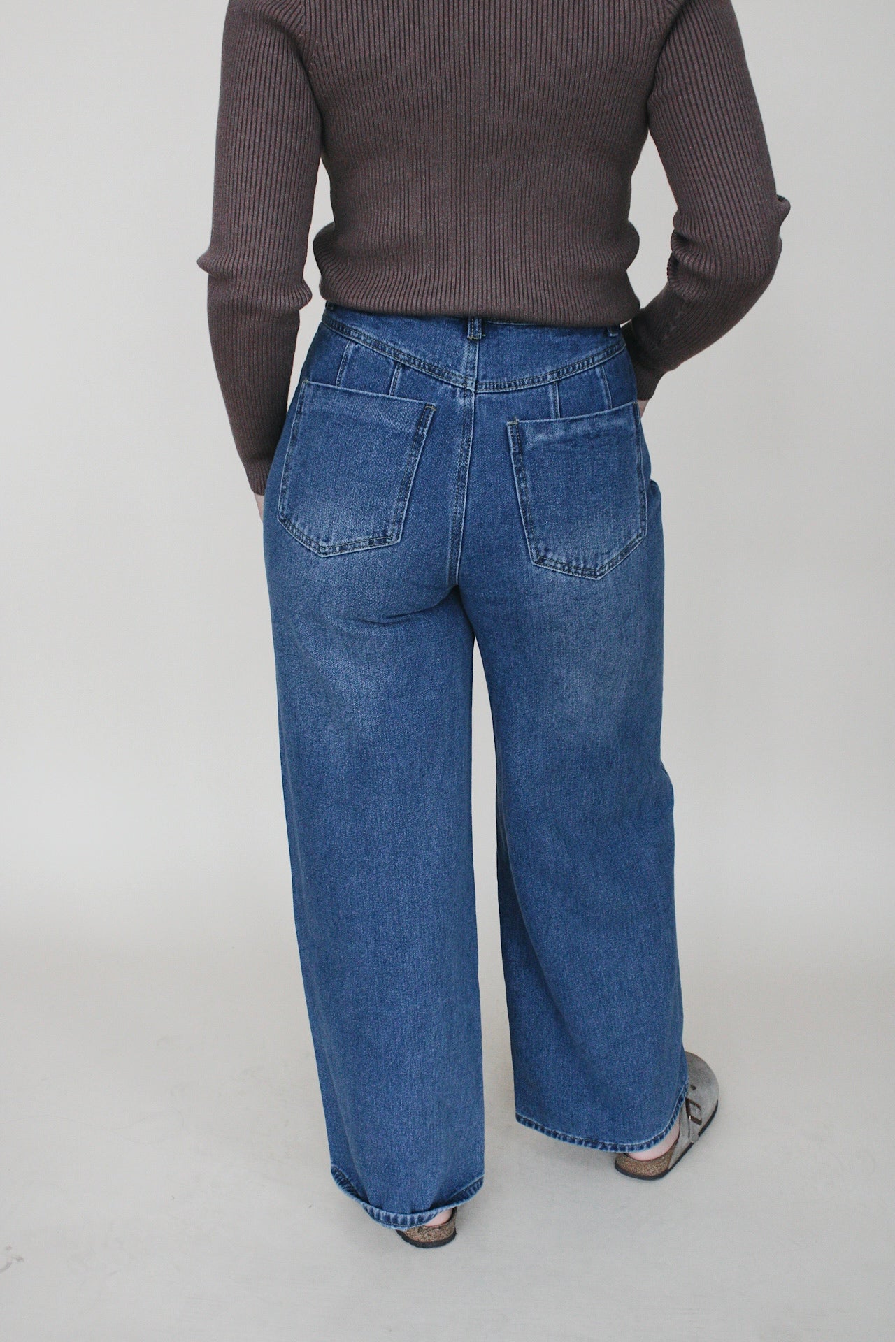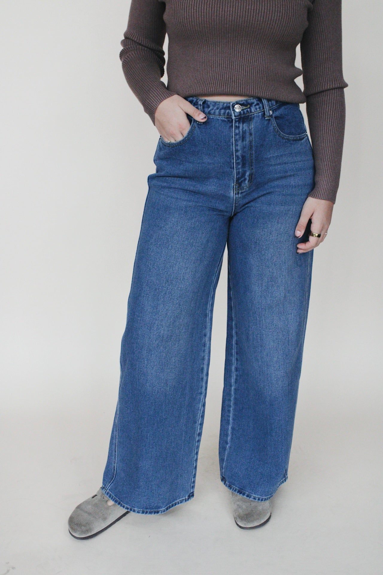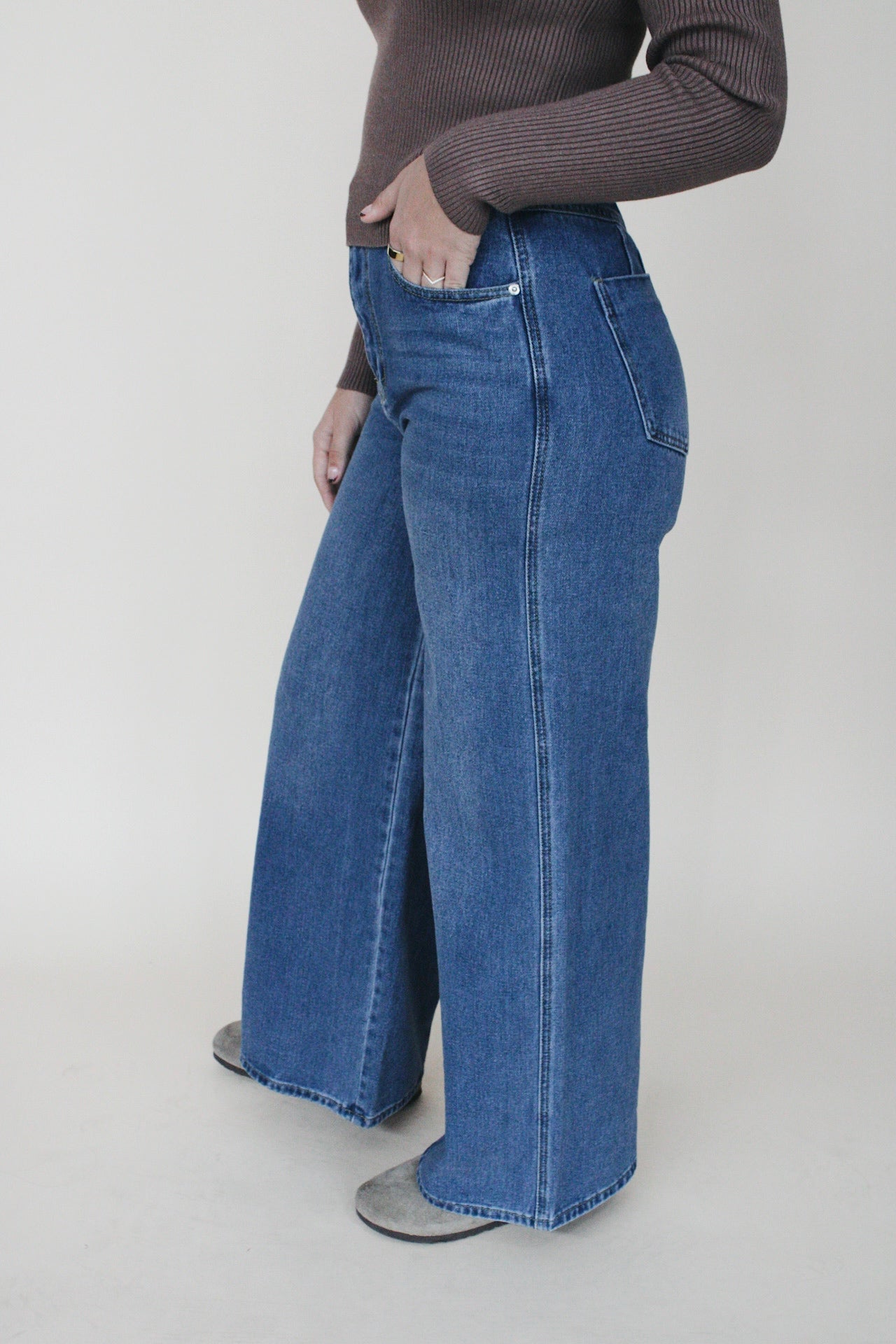 These high rise wide leg jeans in a medium wash offer a flattering fit that sits comfortably at the waist and flows into a relaxed, wide-leg silhouette. Durable and stylish, they blend comfort and classic denim style effortlessly. A wardrobe staple.