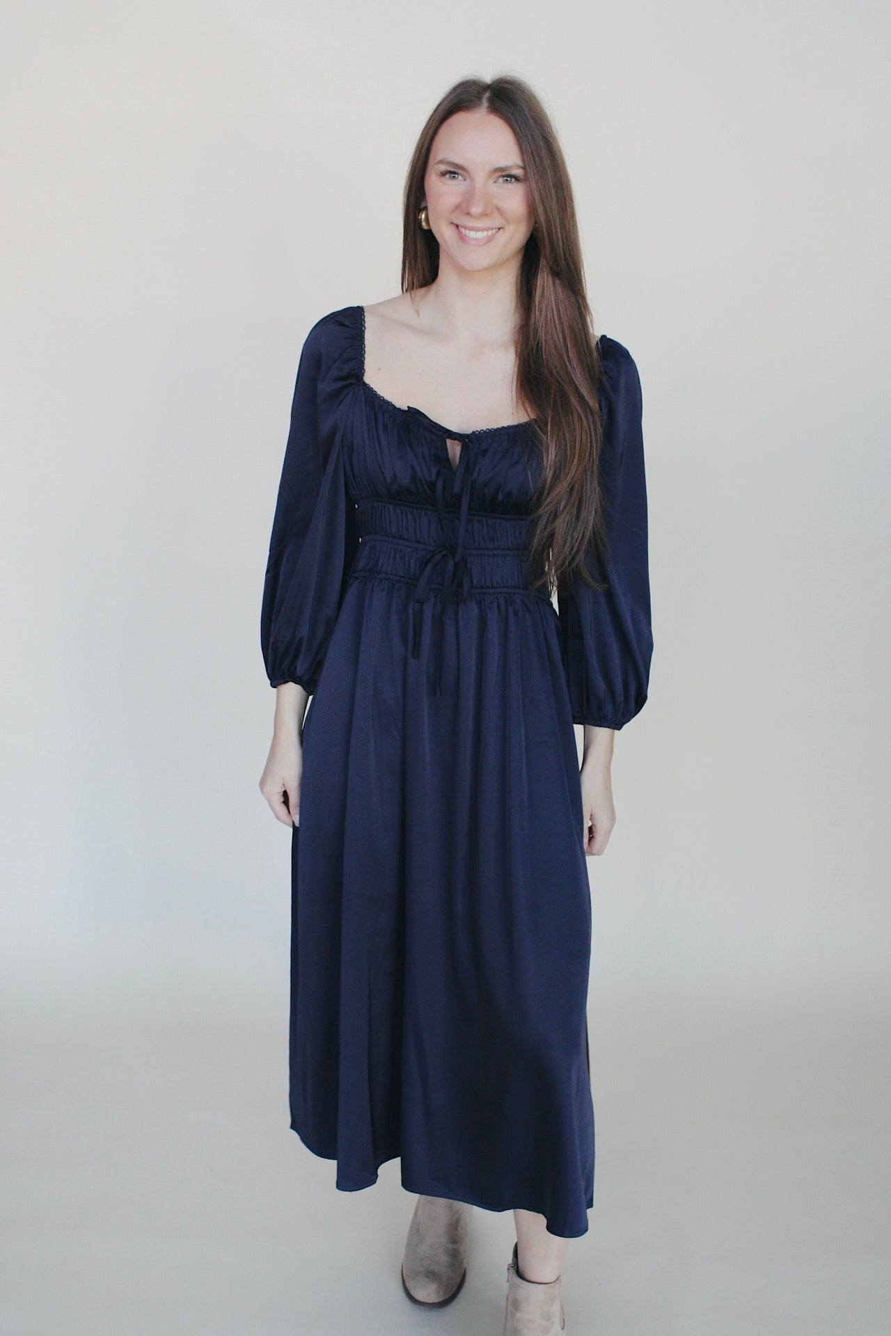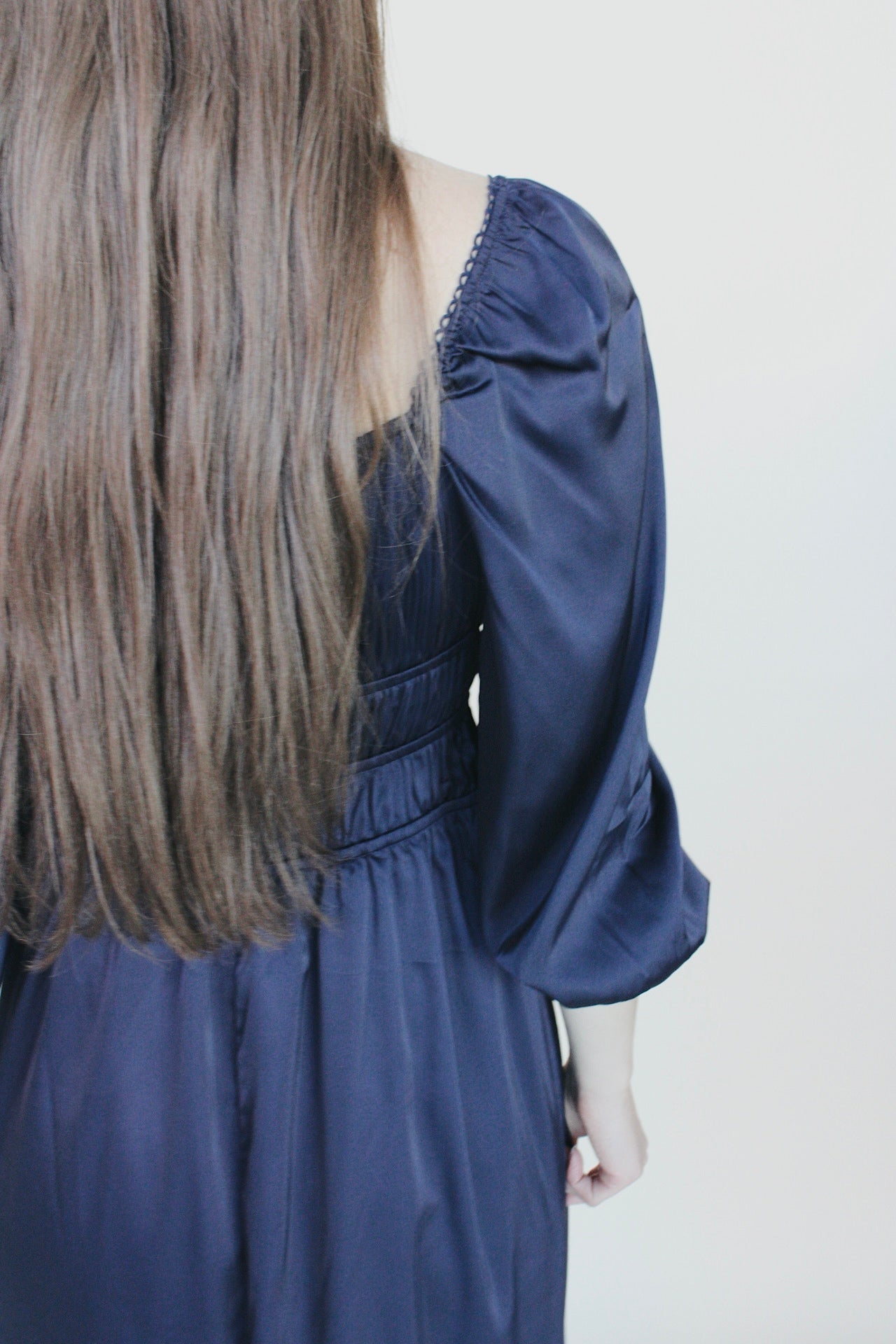 This beautiful dress features a smooth navy satin fabric that offers a sleek and elegant look. Its floor-length design provides a flattering silhouette perfect for special occasions or evening events. Comfortable and stylish, this dress is timeless.