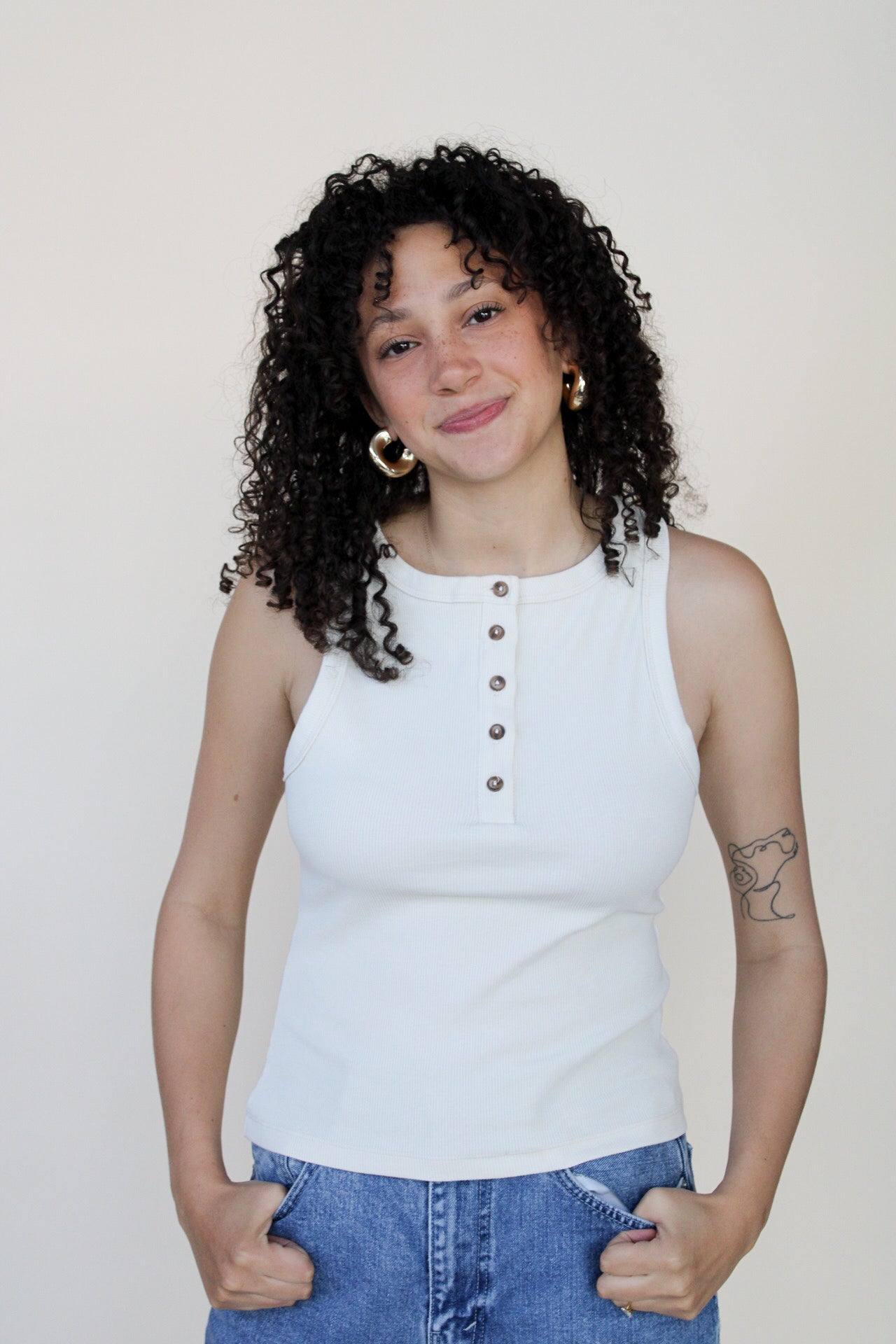 Effortless layering essential with a classic neckline and ribbed construction. The racerback design offers comfortable support, while the henley-inspired button detail adds versatile styling options. Perfect for pairing with your favorite pieces or wearing solo for an understated look.