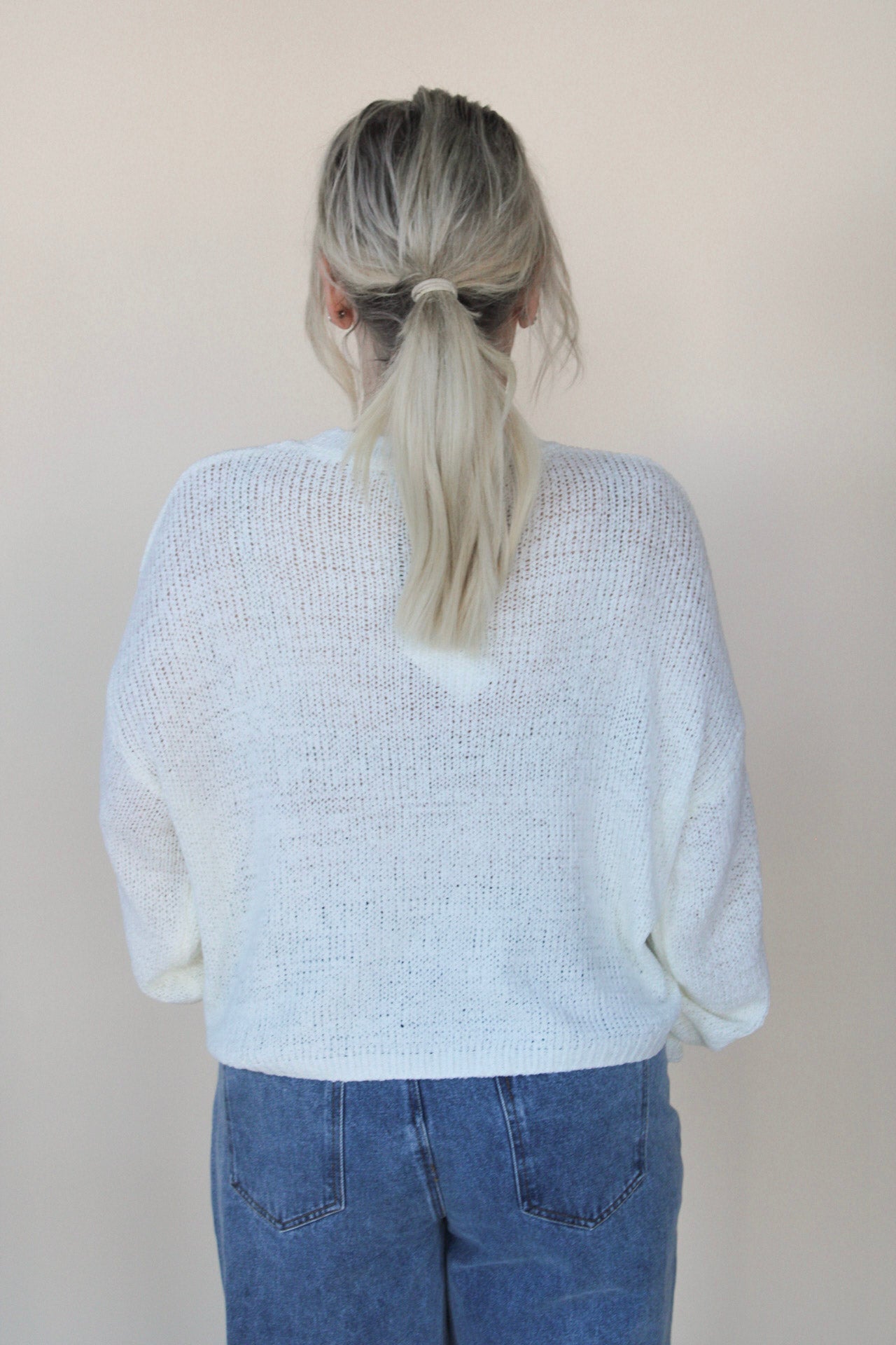This sweater is a timeless wardrobe essential crafted in a crisp white hue. This lightweight knit offers effortless layering for any season, pairing seamlessly with jeans, skirts, or trousers. Perfect for casual days or dressed-up occasions, its classic design ensures you'll reach for it again and again.