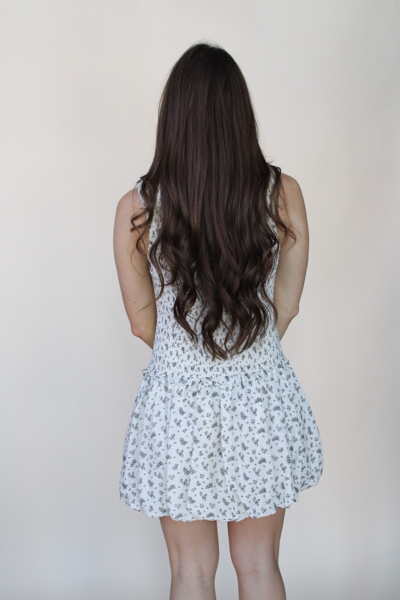 Ivory mini dress featuring an elegant black floral pattern throughout. The smocked dropped waist creates a flattering silhouette, while the bubble hem adds playful movement and dimension. Perfect for casual outings or dressed-up occasions.