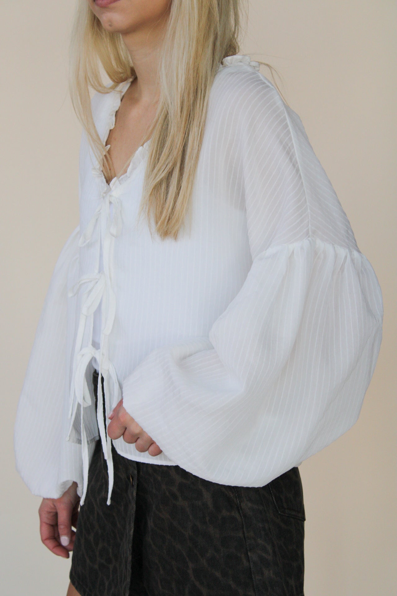 Effortless elegance meets playful style with this off-white balloon sleeve top. Dramatic puffed sleeves add dimension and movement, while delicate front ties let you customize the fit and neckline. Perfect for layering or wearing solo, this versatile piece transitions seamlessly from casual days to dressed-up evenings.