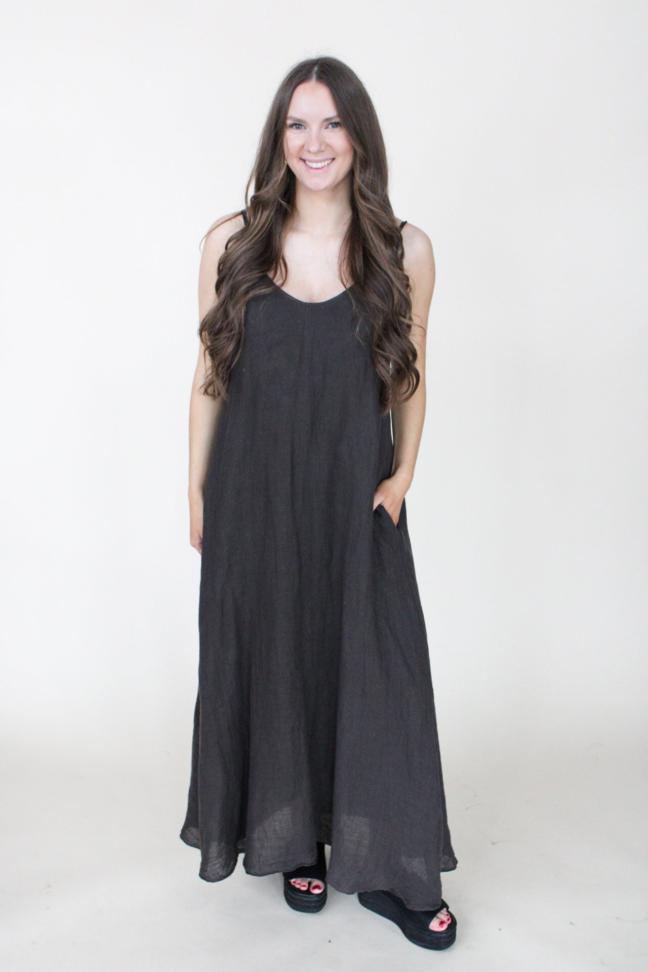 Effortless elegance in pure linen. This chocolate brown maxi dress flows beautifully with every movement, crafted from 100% linen and made in Italy. Perfect for warm weather styling, from casual days to evening occasions. The relaxed silhouette and natural fabric create timeless, breathable comfort.