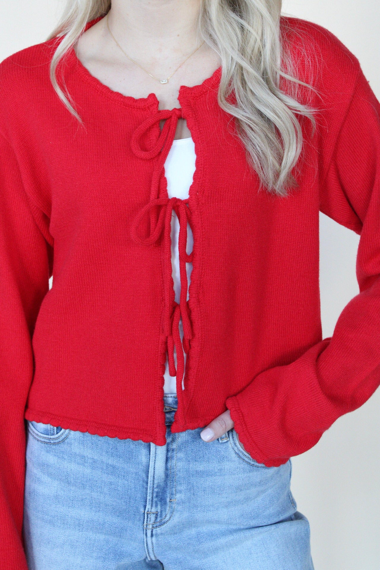 Elevate your layering game with this charming tie-front cardigan. Featuring delicate scalloped edges and a rich red hue, it ties up the front for an adjustable, flattering fit. Perfect for adding warmth and style to any outfit, this sweater transitions seamlessly from casual to polished.