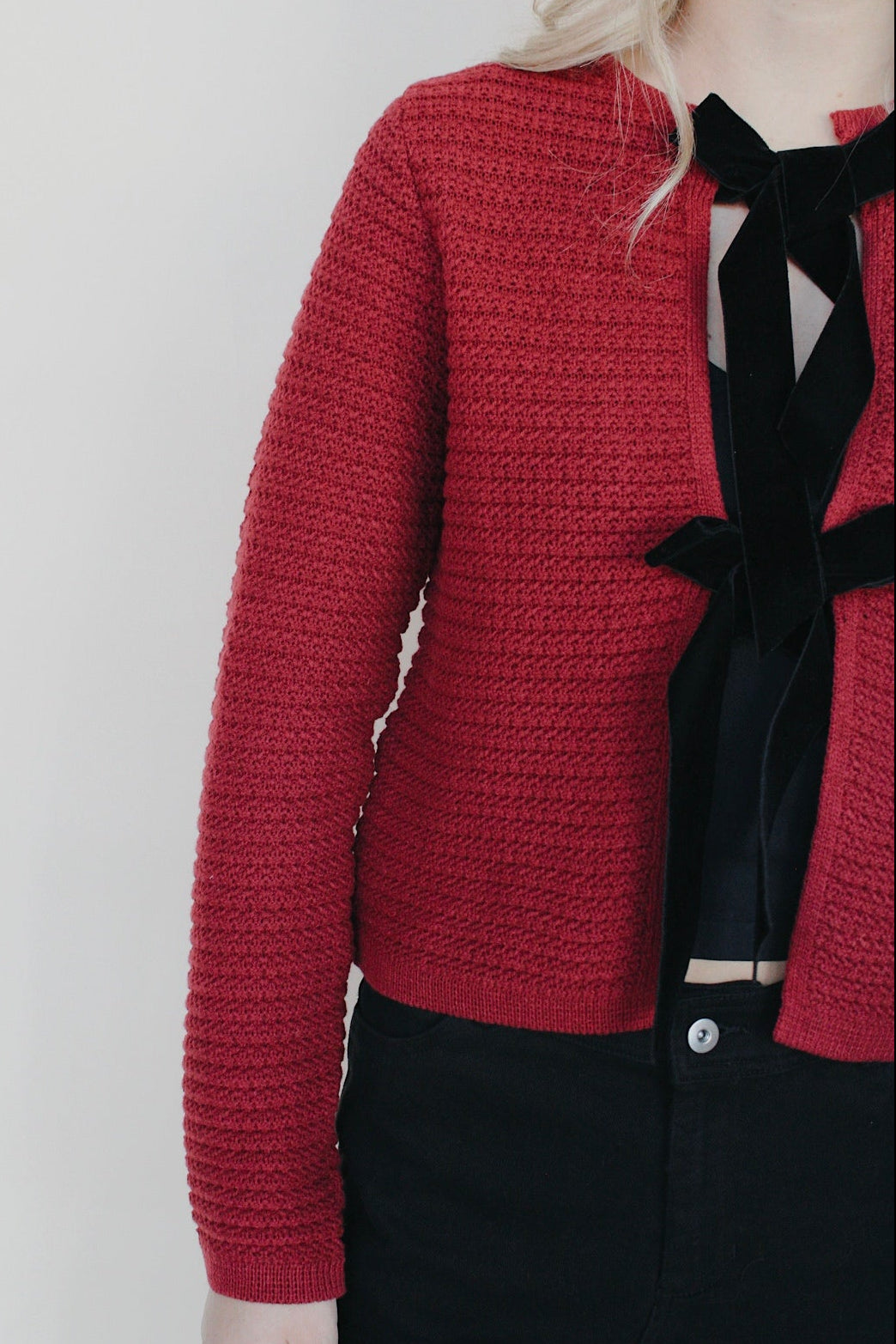 This burgundy cardigan features soft velvet tie bows along the front, adding a charming touch to your outfit. Perfect for layering, it combines warmth with a delicate, feminine detail that complements any look.