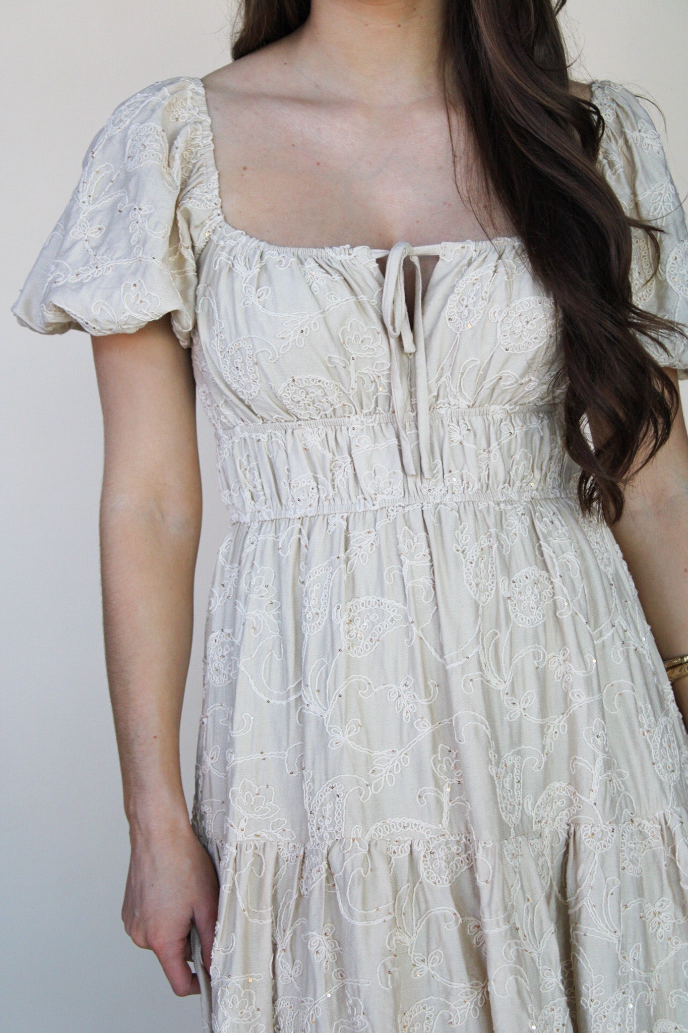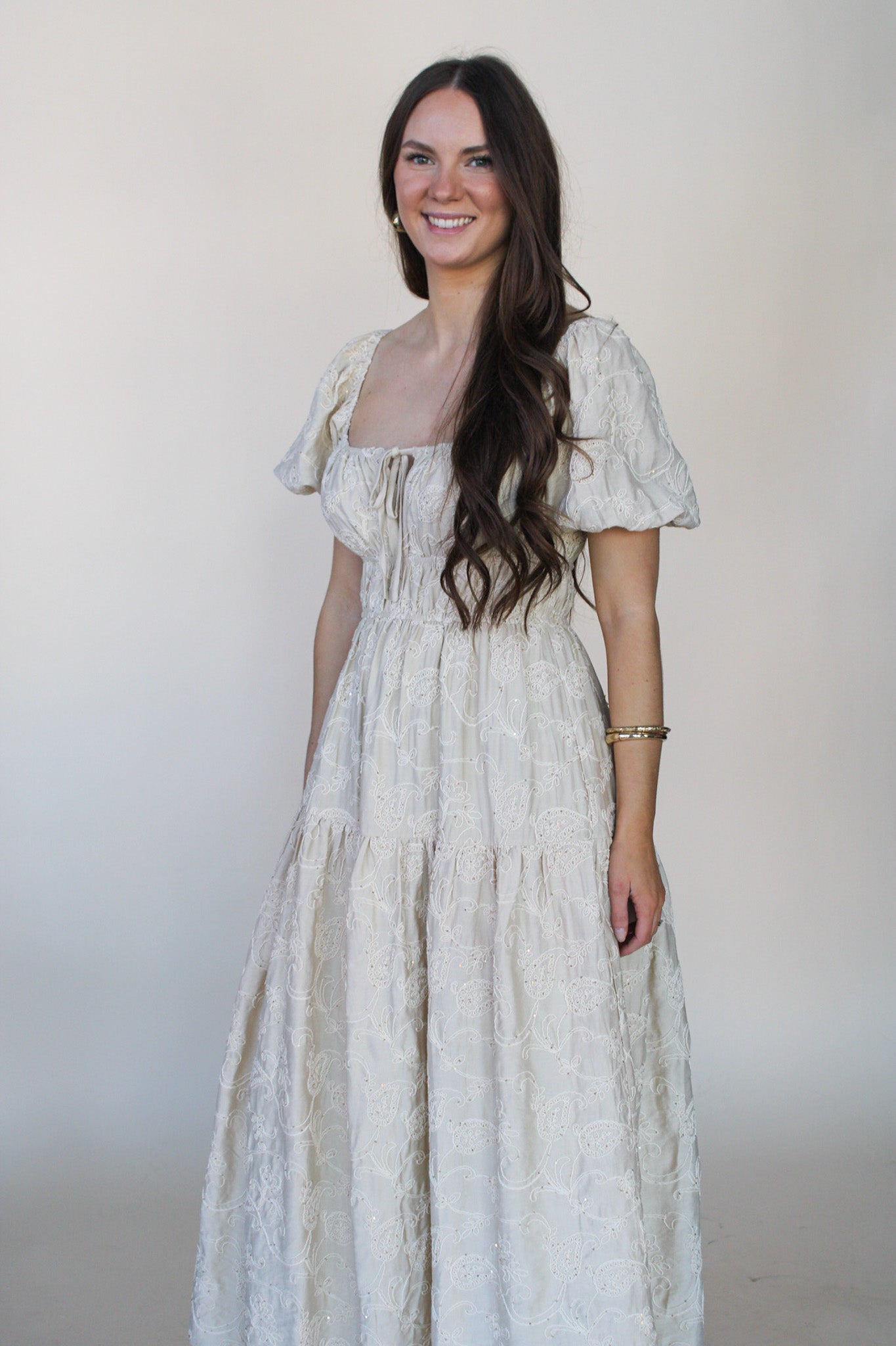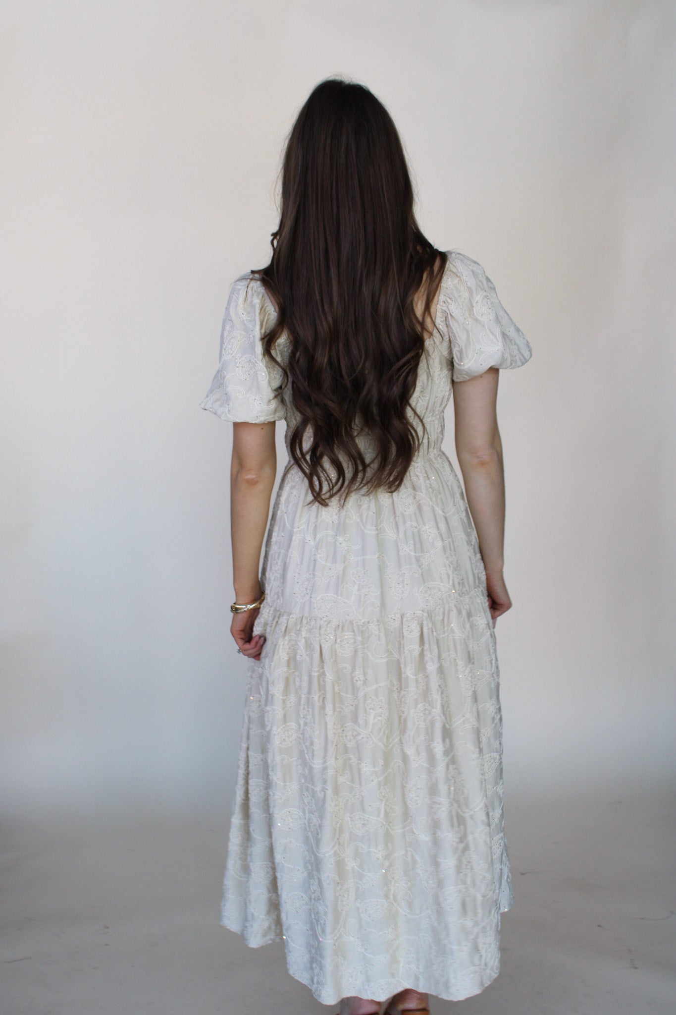 Elevate your wardrobe with the Penelope Midi Dress, a beige midi featuring an eye-catching textured pattern accented with delicate gold sequins. Perfect for date nights, weddings, or any occasion calling for understated glamour. The subtle shimmer adds just the right touch of sparkle without overwhelming your look.