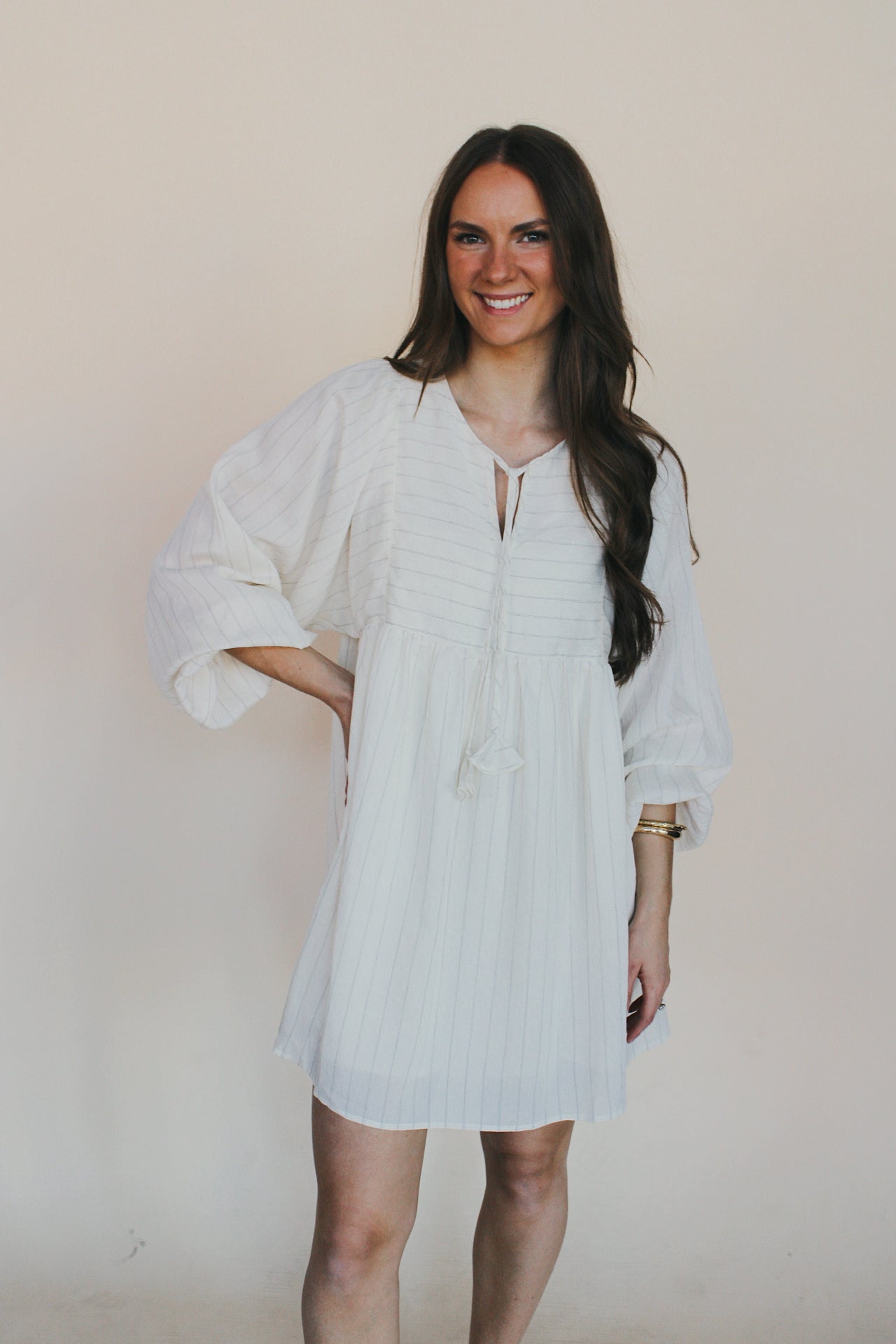 This pinstripe babydoll mini dress features a soft oatmeal base with delicate thin black stripes. Its loose, flowing silhouette offers comfort and effortless style, perfect for warm days or layering. A versatile piece to dress up or down.