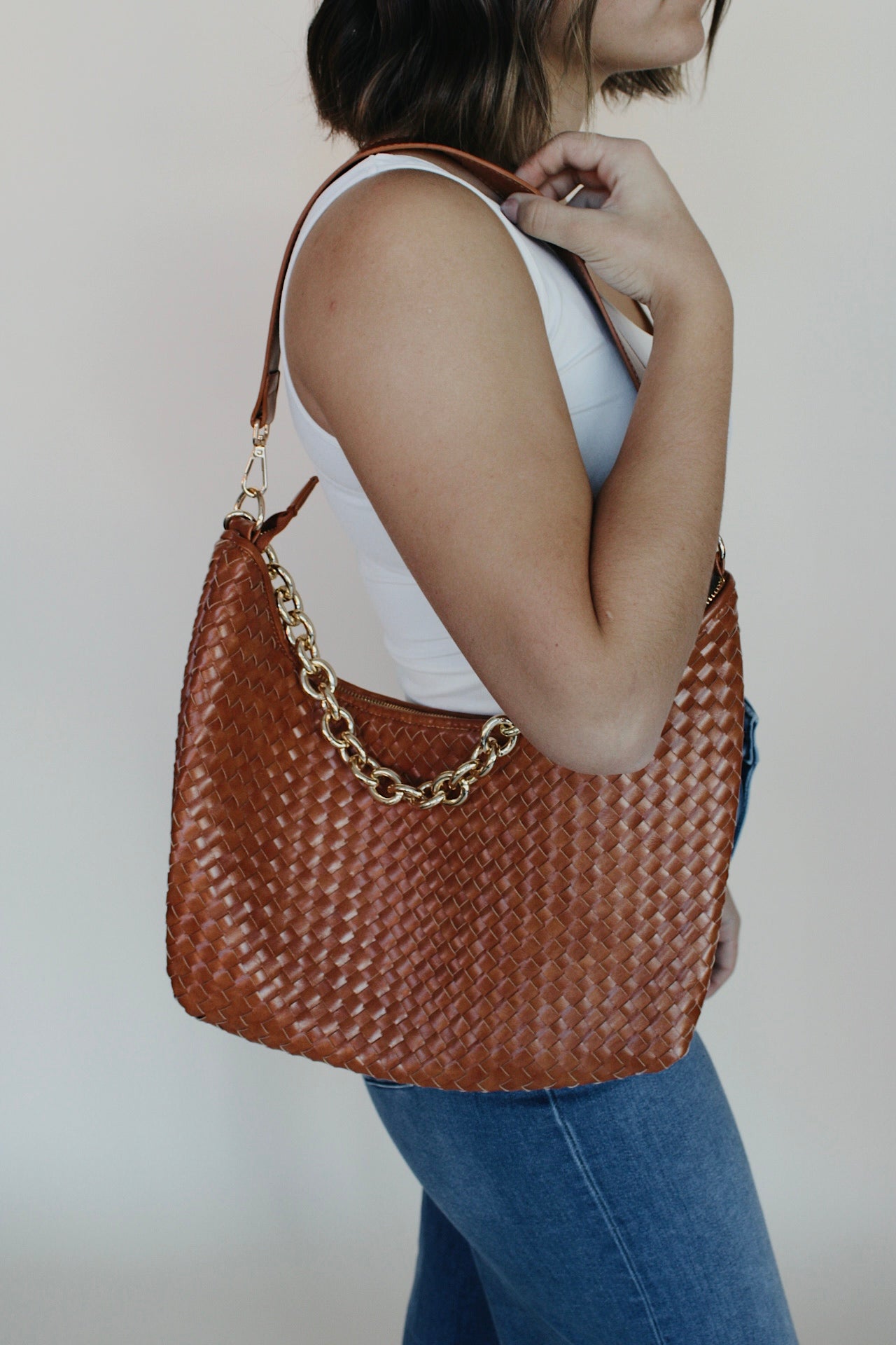 The Sienna Slouchy Woven Shoulder Bag in a rich brown and a textured woven design, offers a stylish yet relaxed look. It includes a detachable gold chain, allowing you to switch between a chain strap and a comfortable shoulder carry. Perfect for everyday use, this bag combines versatility with an elegant touch.