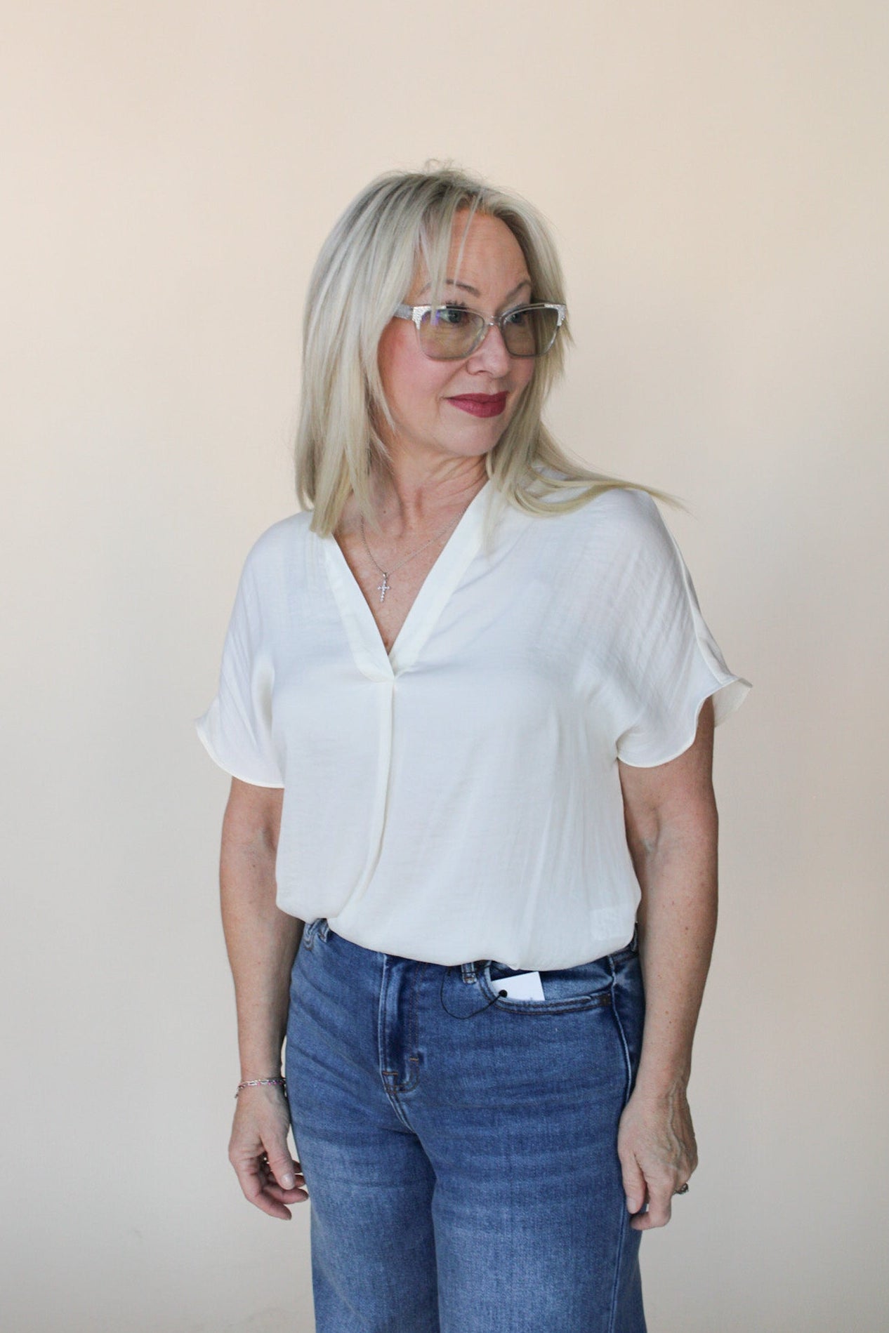 White Blouse- Model is 5'0" and wearing a size small.