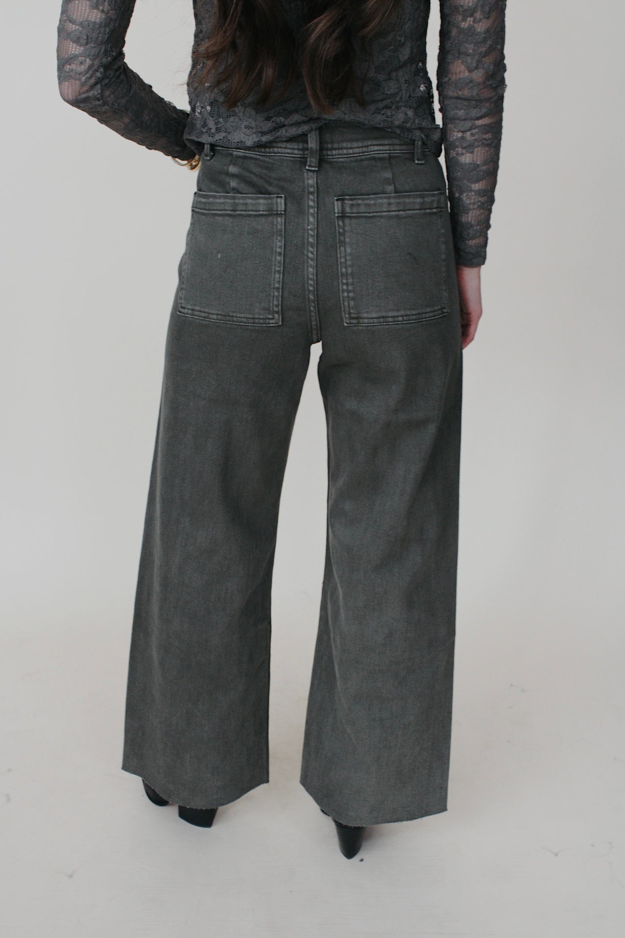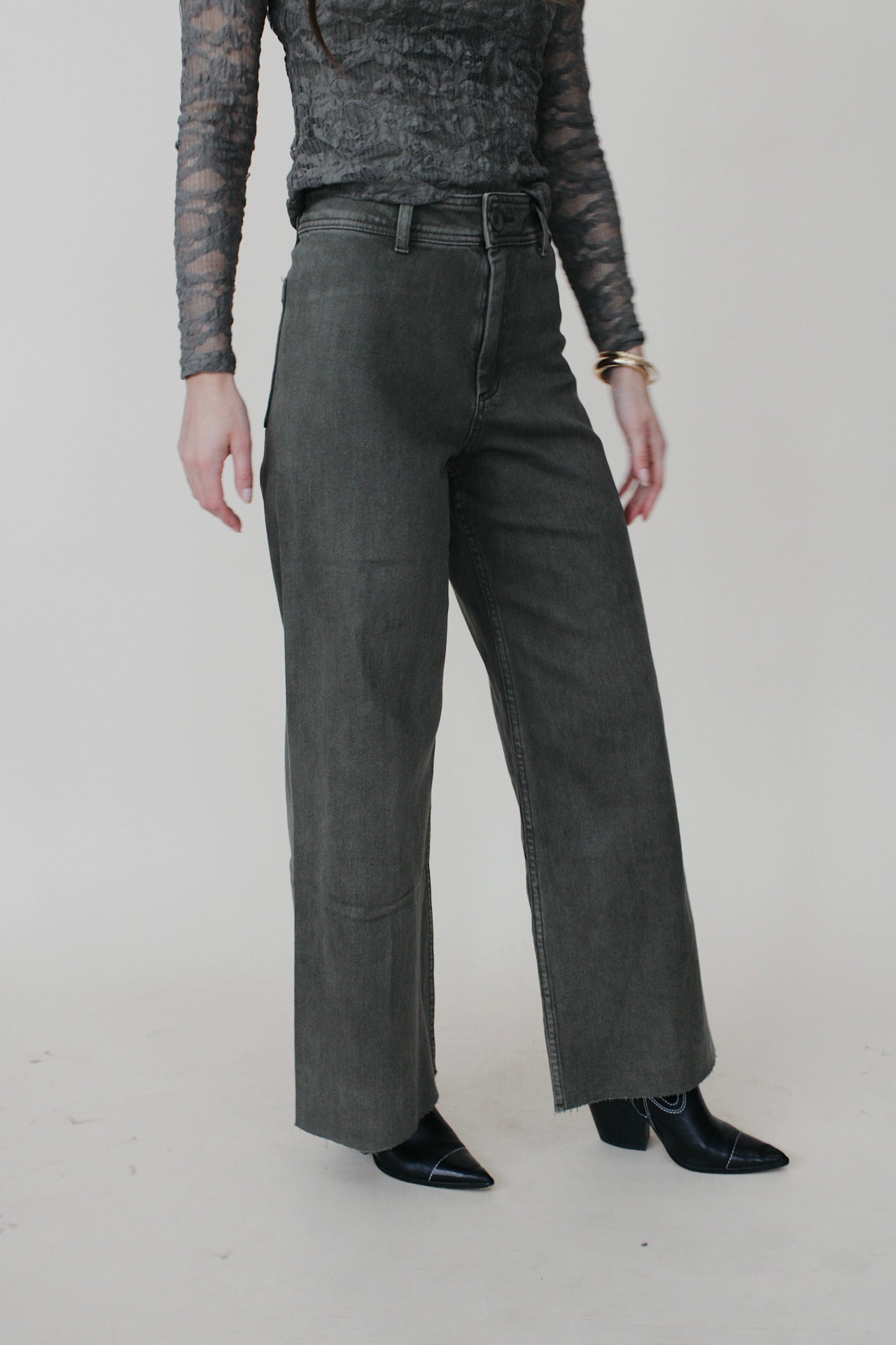 These straight wide leg denim pants in dark olive wash offer a comfortable fit with a modern, relaxed style. The stretchy wide leg design allows for comfortability and easy movement. Perfect for everyday wear or casual occasions.