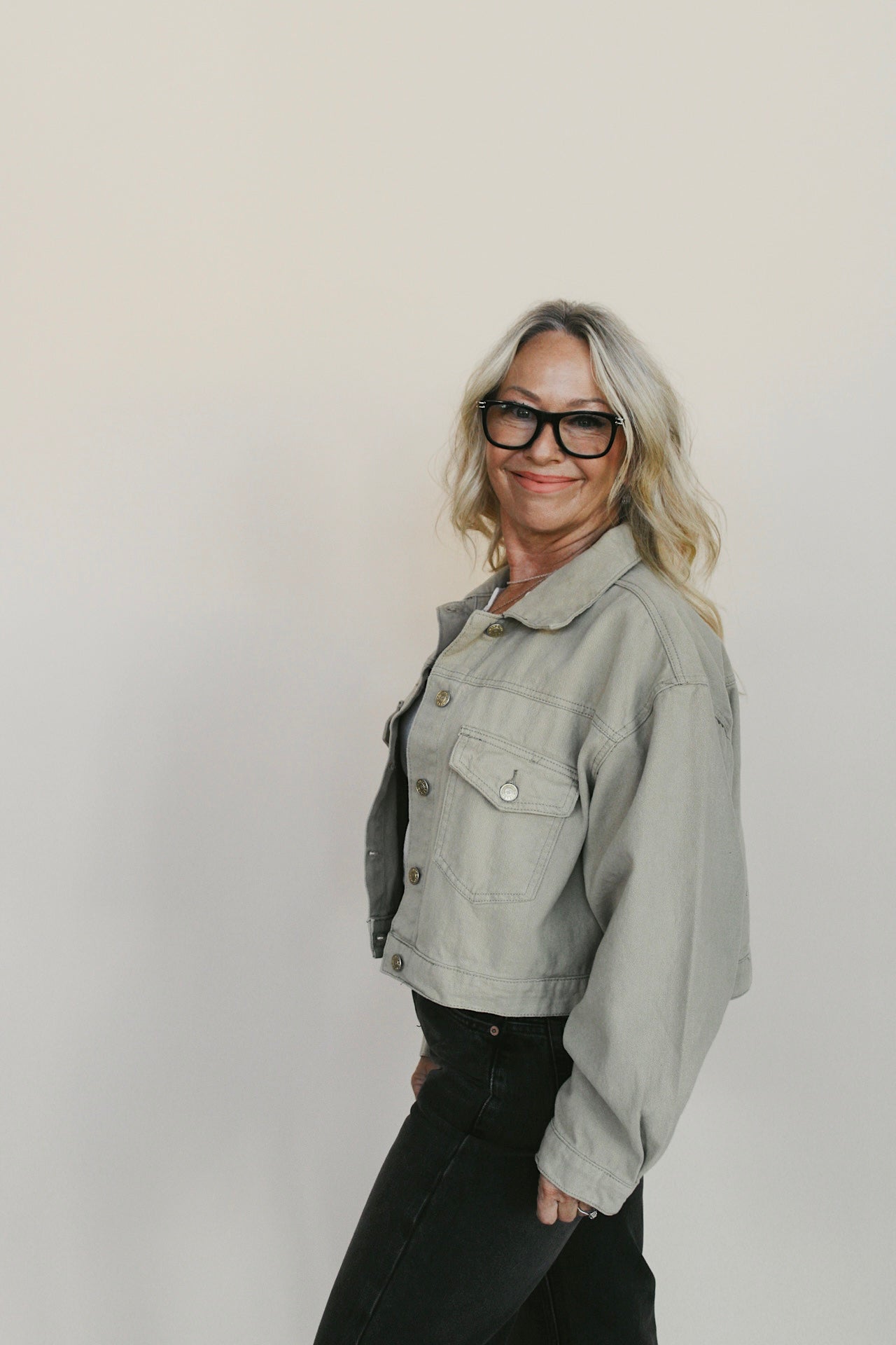 This cropped jacket in a super soft denim fabric features a versatile khaki shade, perfect for layering. Its shorter length adds a modern touch while providing lightweight warmth for cooler days. A perfect addition to any wardrobe.