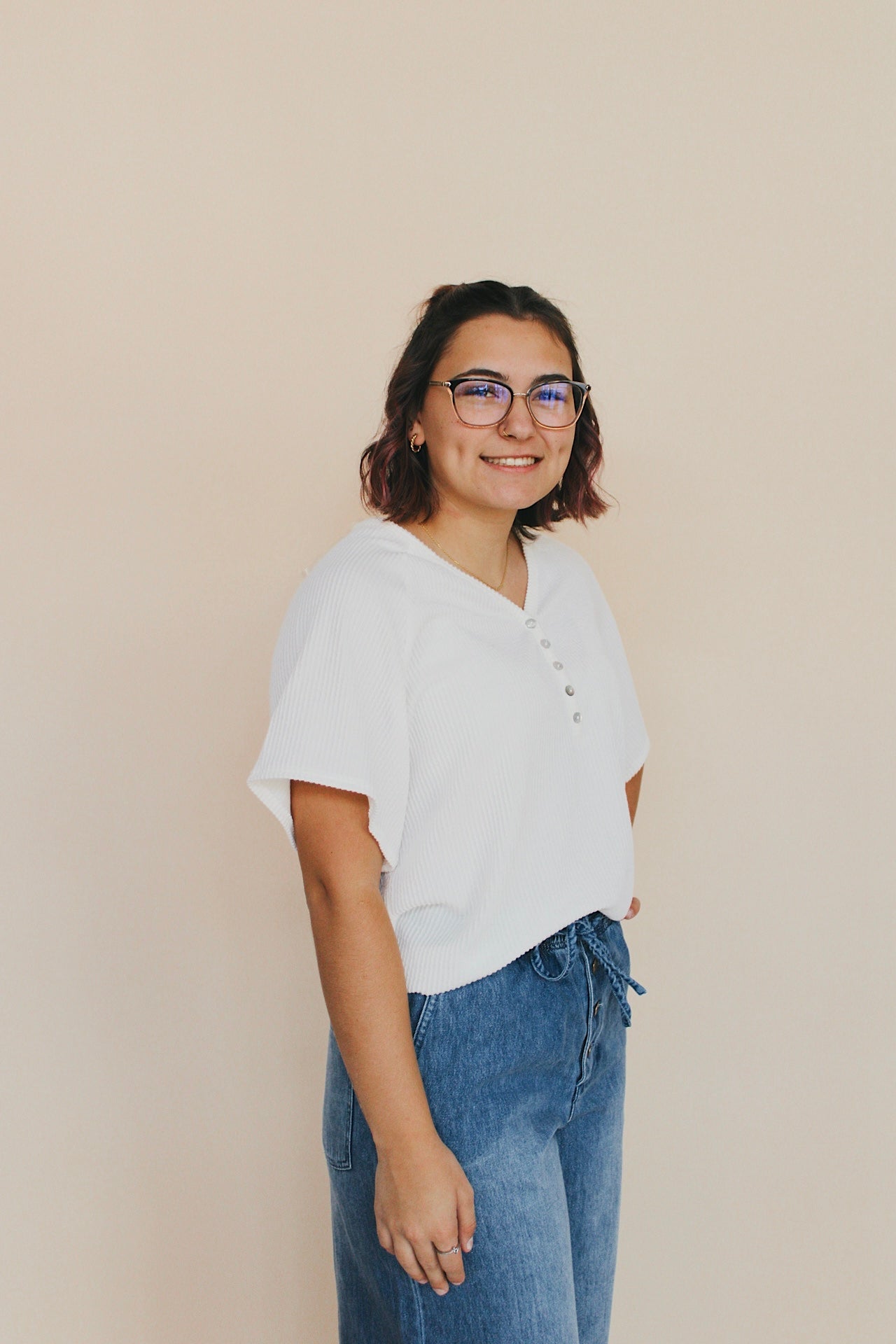This off white textured rib top features a short sleeve with a subtle ribbed pattern and button detailing. Crafted for both comfort and style, this pullover provides a sophisticated layering option that pairs well with various outfits.