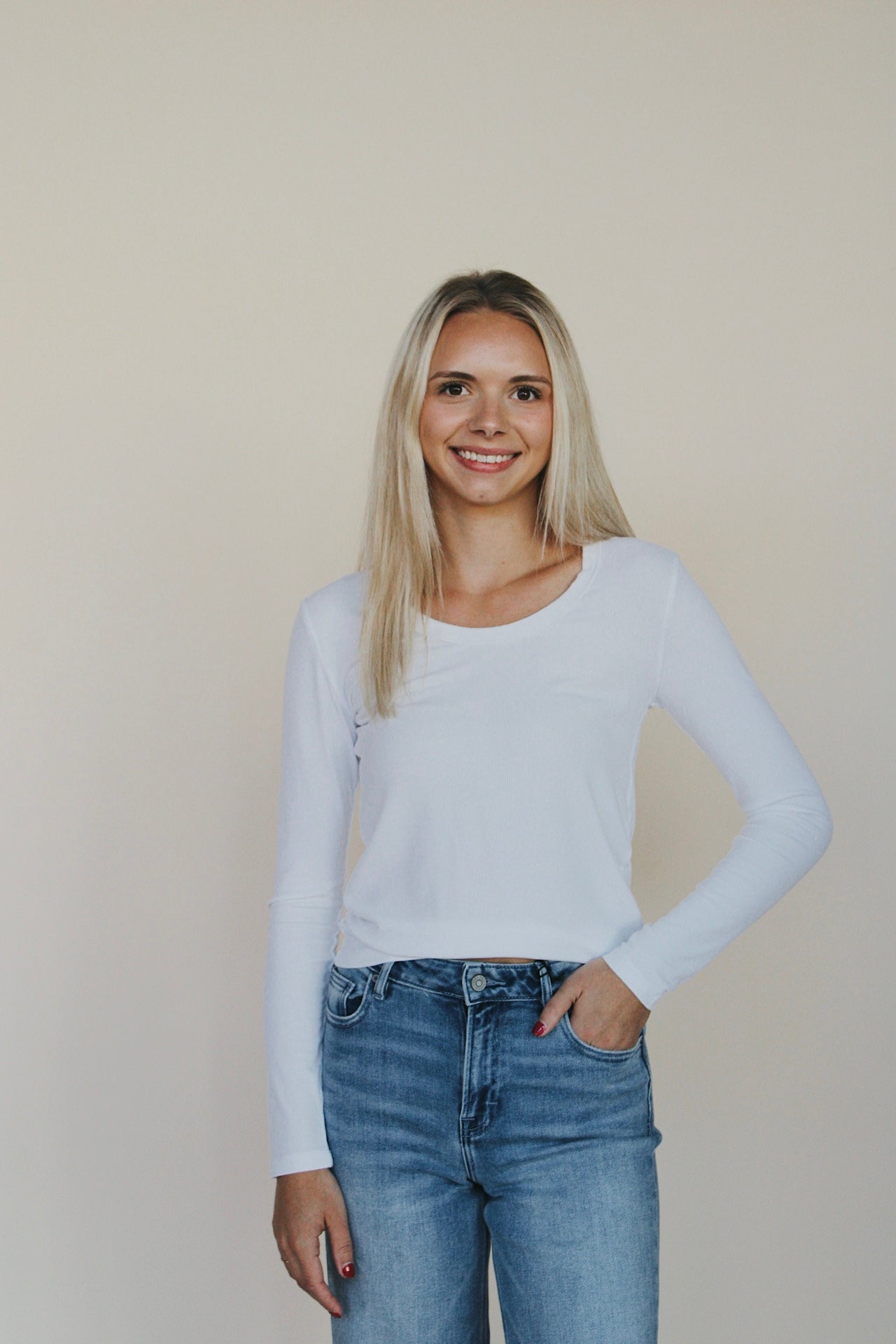 Experience comfort all day with this white ultra soft long sleeve. Made from a ribbed fabric, this long sleeve offers a cozy, gentle feel against your skin. Perfect for layering or wearing on its own for a soft, classic look.