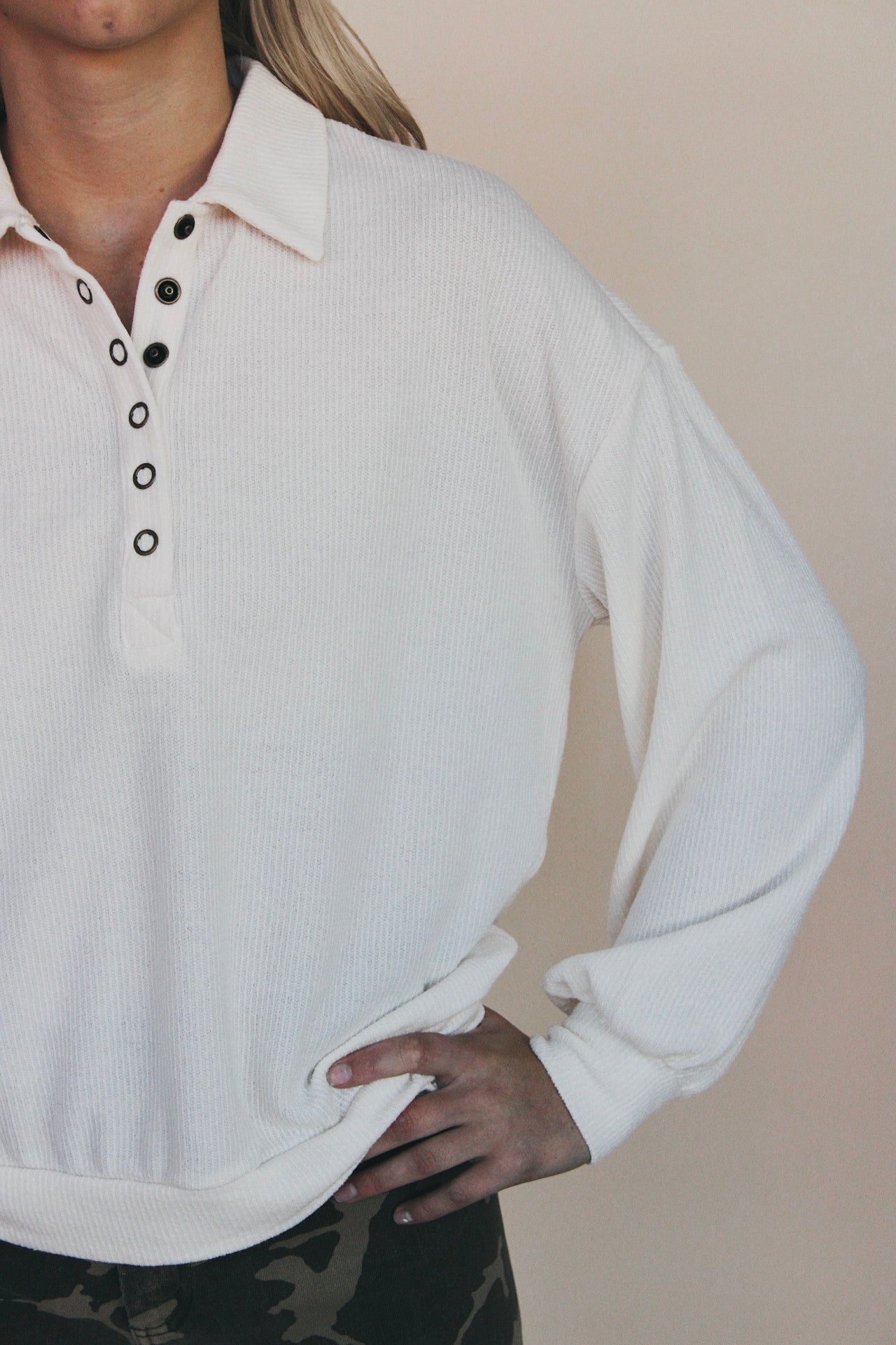 The Vera Collared Long Sleeve features a comfortable knit fabric with a collared quarter-button design. This sweatshirt offers a relaxed fit and easy layering for everyday wear, combining cozy warmth with casual style. Perfect for cooler days, it adds a simple and polished touch to your wardrobe.