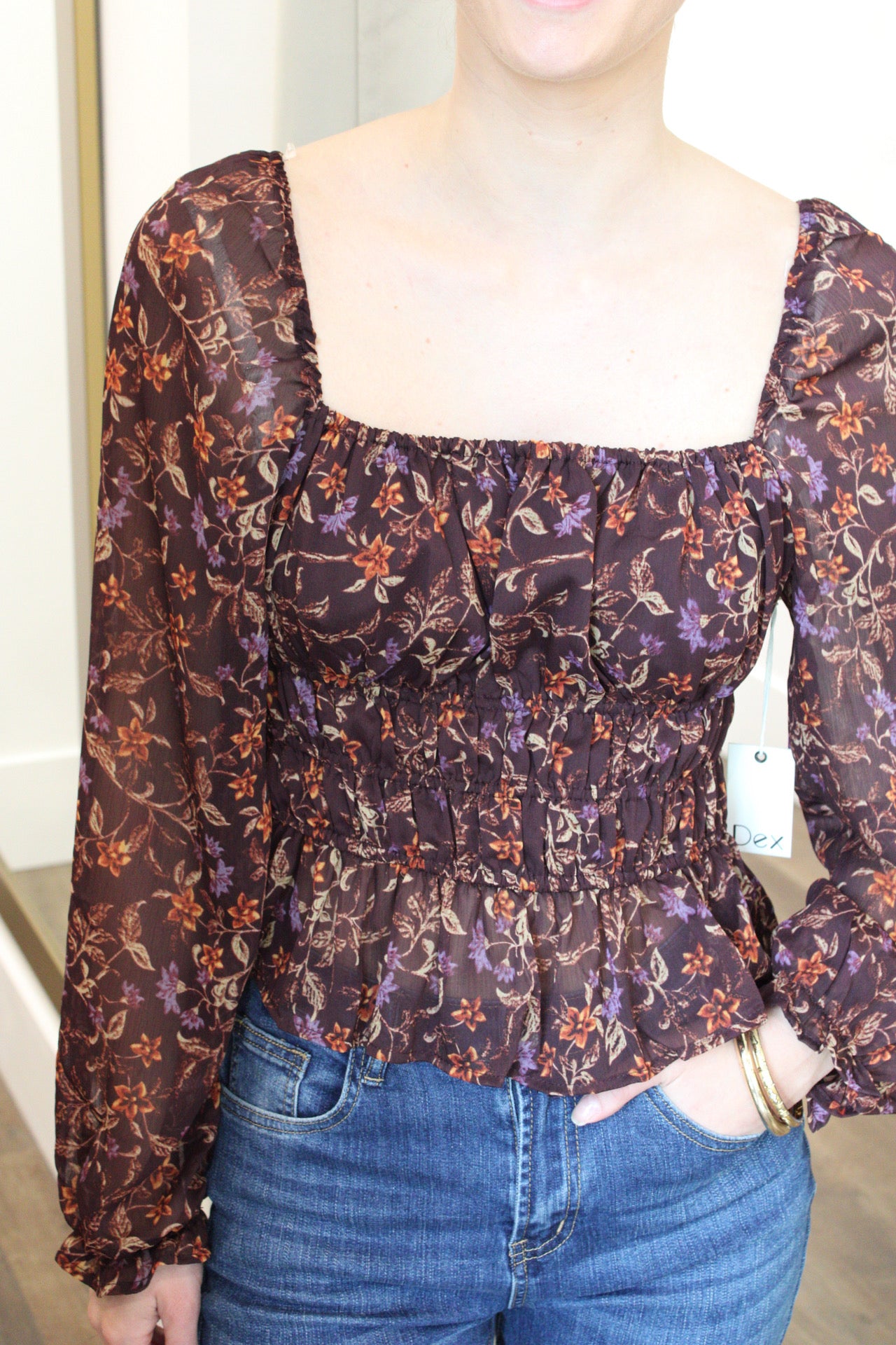 The Victoria Wild Flower blouse features a dark plum color with a delicate wildflower pattern. Its long sleeves provide a comfortable fit, making it an elegant choice for both casual and dressy occasions. This blouse adds a touch of nature-inspired charm to your wardrobe with its soft, flowing fabric.