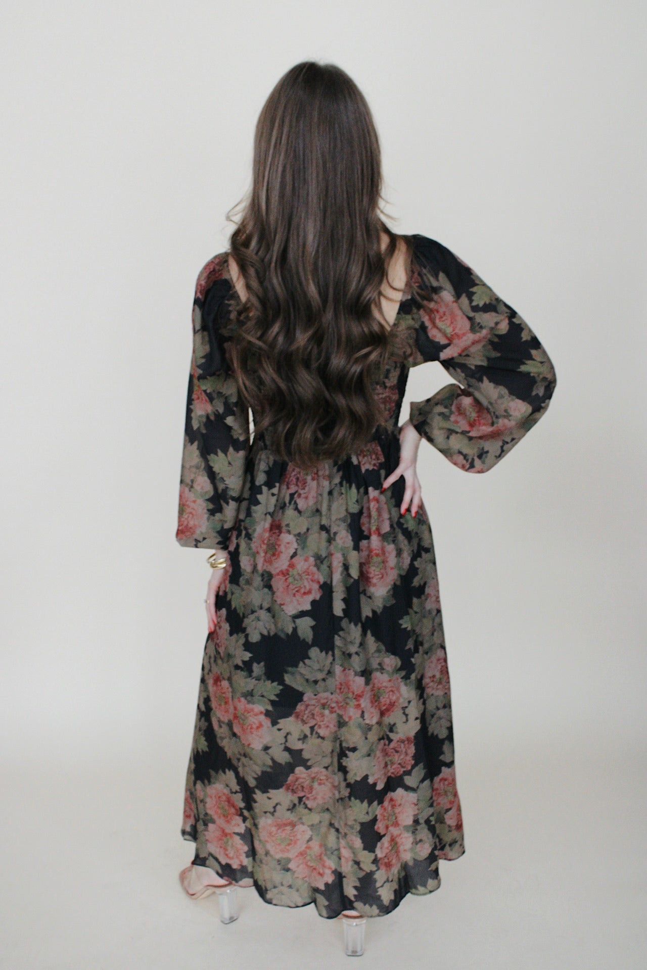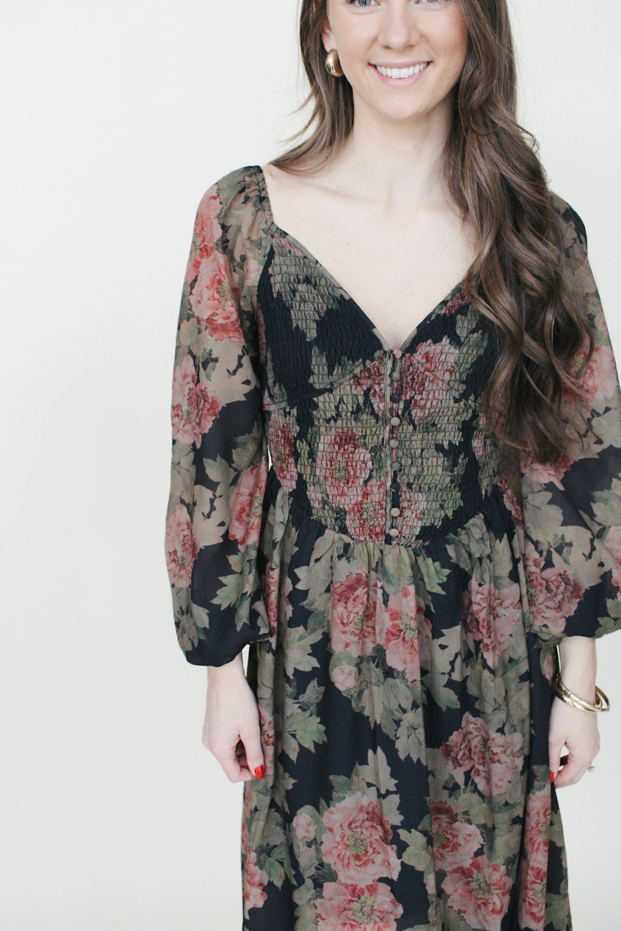 This gorgeous dress features a black base with a vibrant multi floral print. Its smocked bust offers a comfortable, flattering fit, enhanced by delicate button detailing. This maxi dress combines effortless style with a relaxed, flowing silhouette perfect for any occasion.